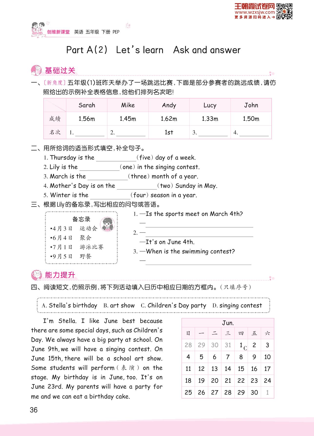 2023下册五年级英语人教PEP版 Unit 4 Part A(2)—Let’s learn Ask and answer