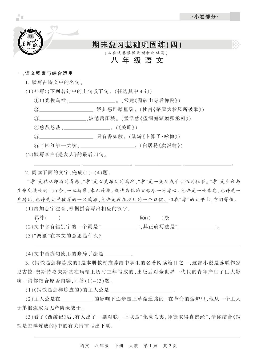 王朝霞期末小卷期末复习基础巩固练(四)一部编八语八年级下册语文(人教版)【0】