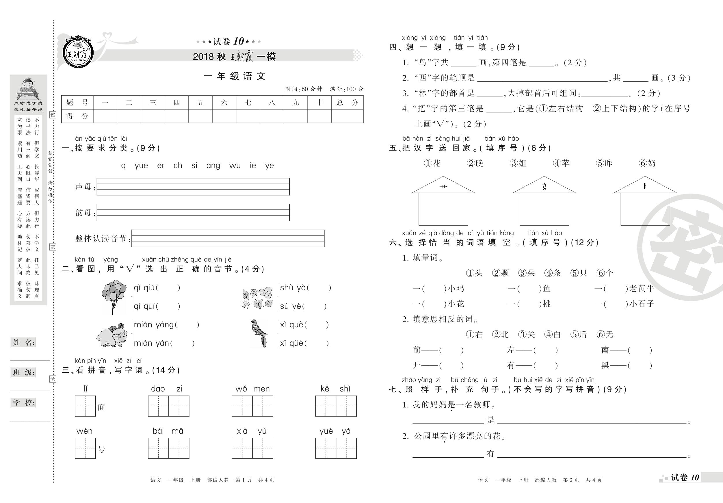 王朝霞期末模拟卷一年级上册语文(人教版)_R210731185746【10】