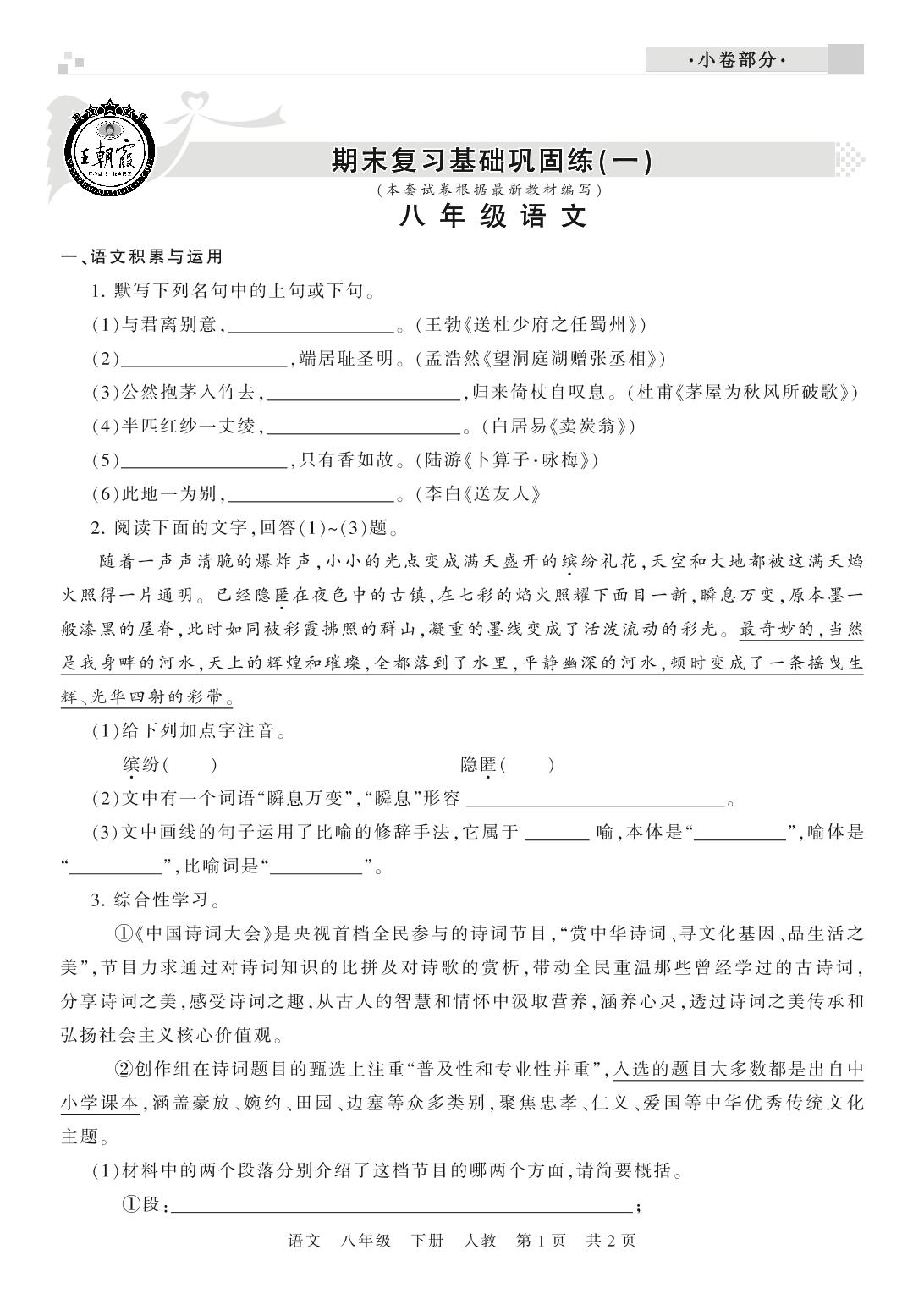 王朝霞期末小卷期末复习基础巩固练(一)一部编八语八年级下册语文(人教版)【0】