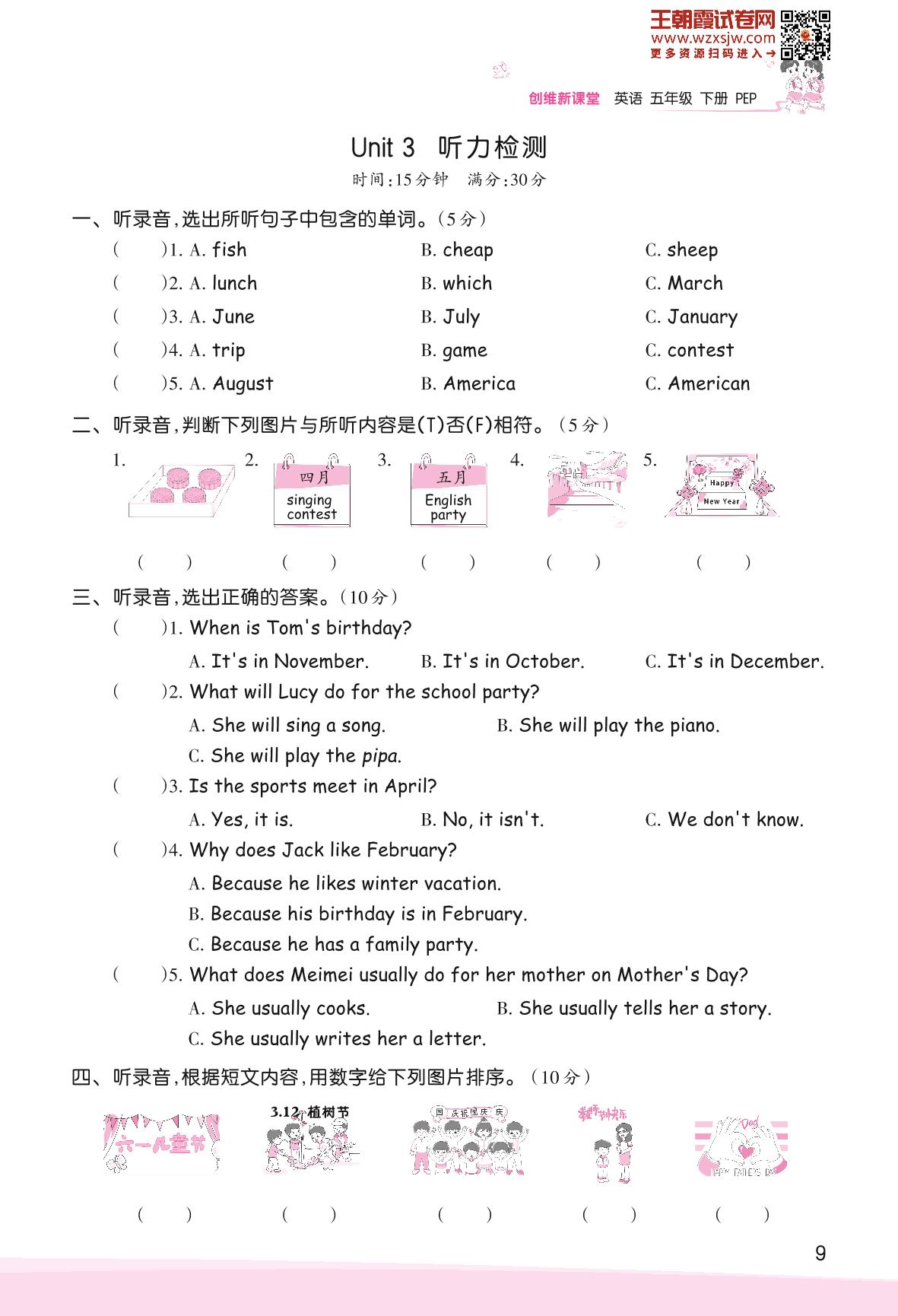 2023下册五年级英语人教PEP版 Unit 3 My school calendar—听力检测