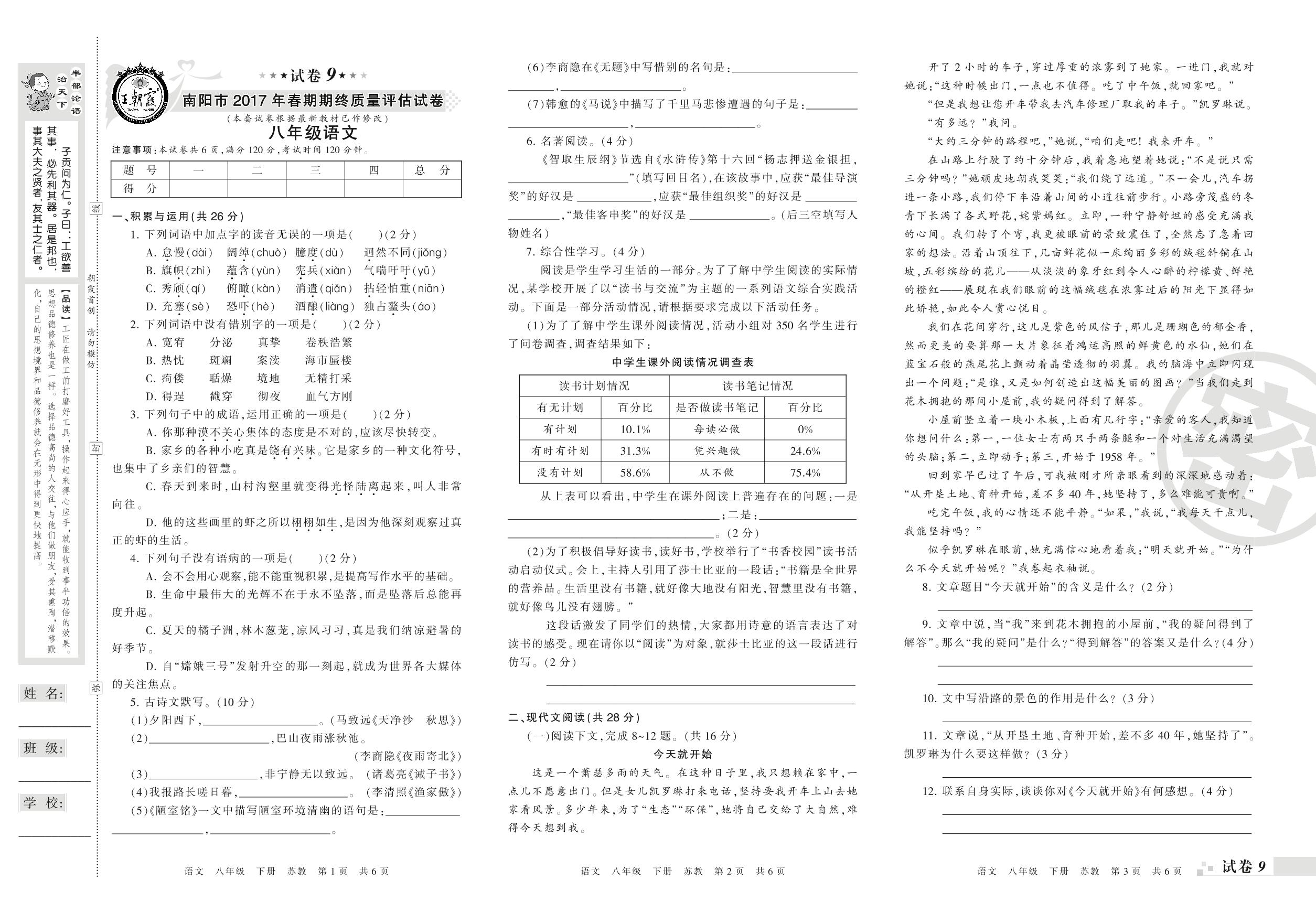2016-2017学年第二学期南阳市八年级语文试卷(苏教版)【9】