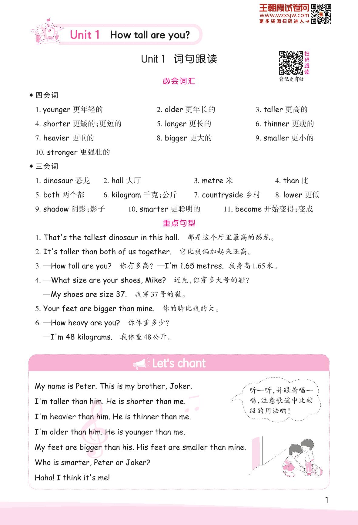 2023下册六年级英语人教PEP版 Unit 1 How tall are you?—词句跟读
