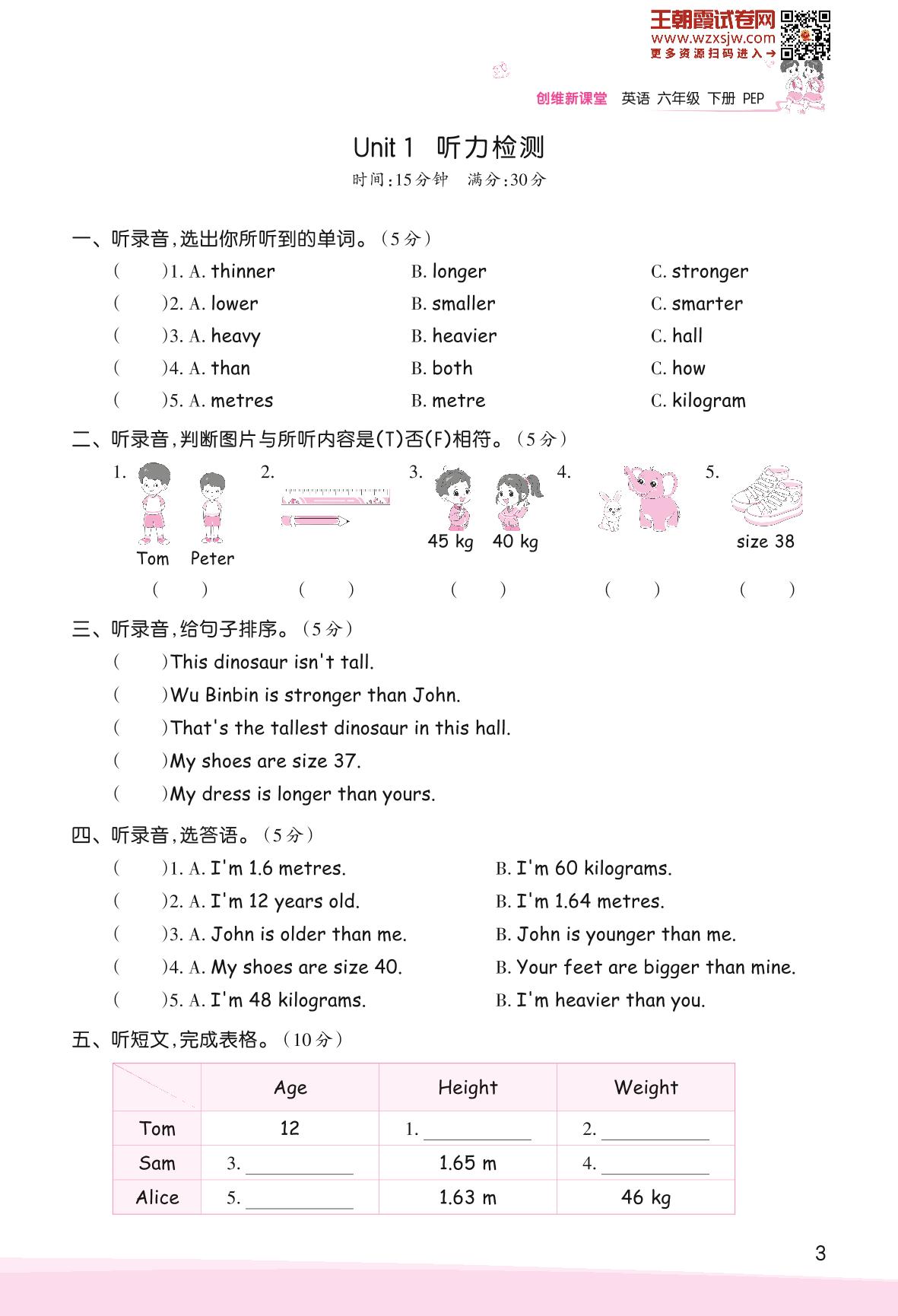 2023下册六年级英语人教PEP版 Unit 1 How tall are you?—听力检测