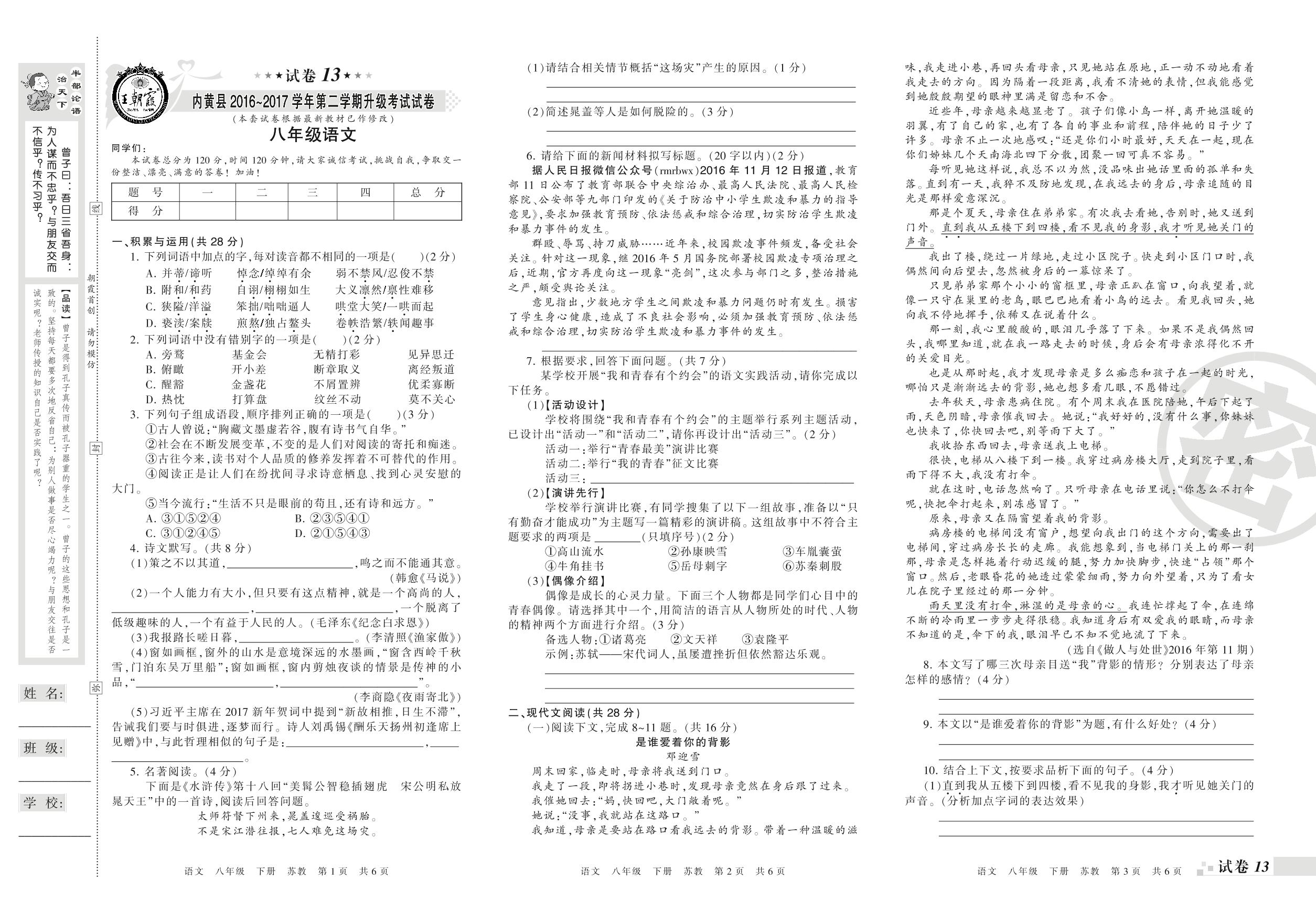 2016-2017学年第二学期安阳市内黄县八年级语文试卷(苏教版)【13】