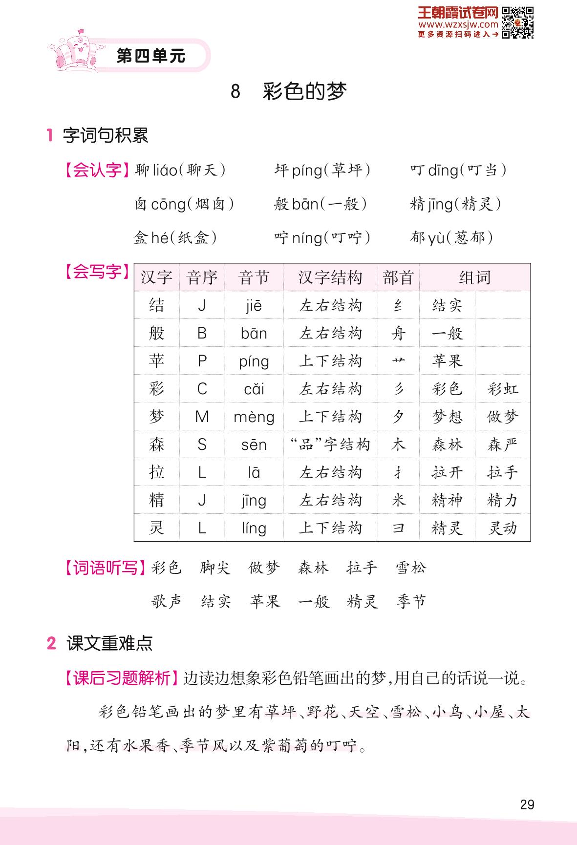 2023下册二年级语文人教版 助学手册 第四单元——8 彩色的梦