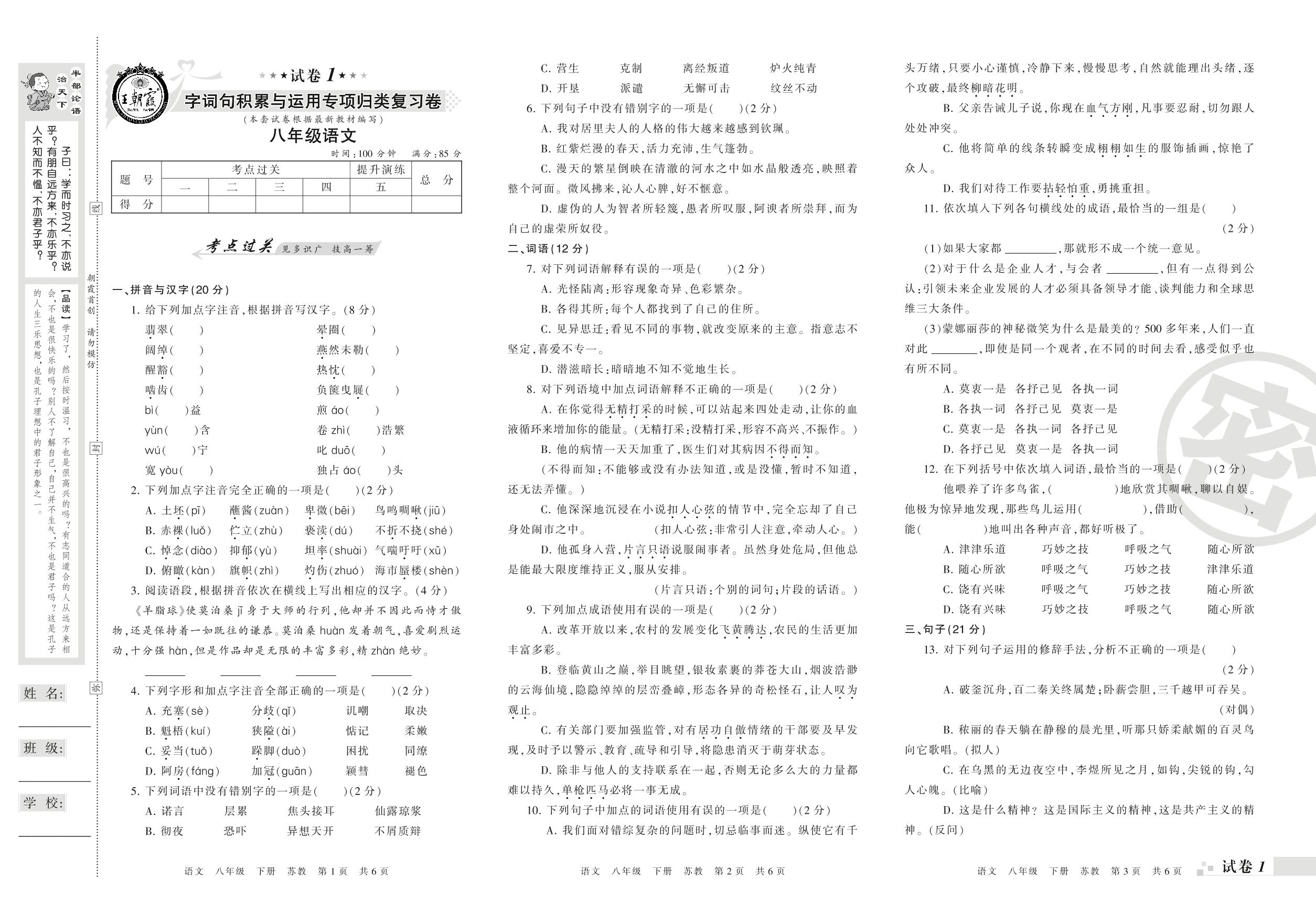 王朝霞期末专项卷——字词句积累与运用专项归类复习卷八年级下册语文(苏教版)_R210802191659【1】