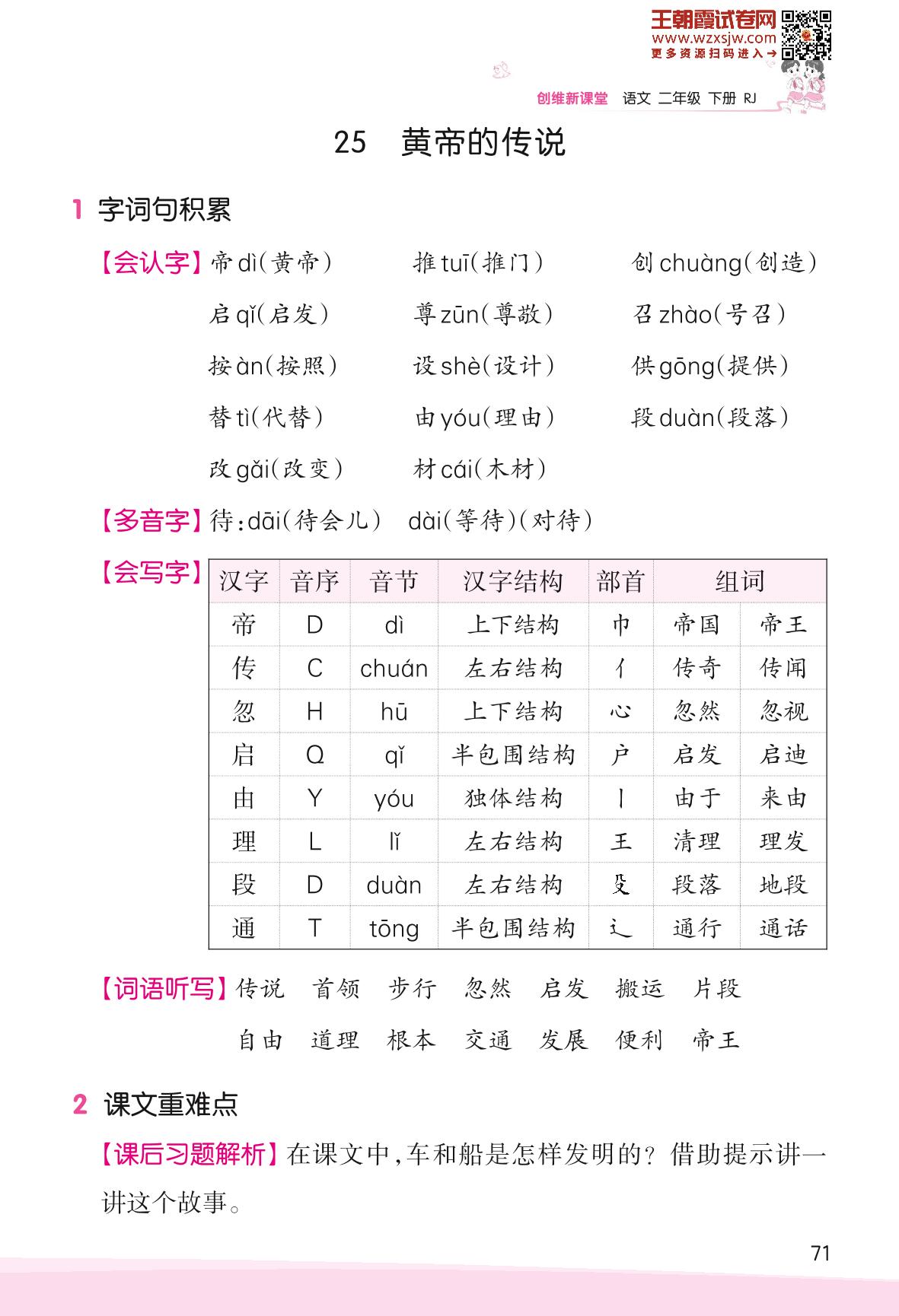2023下册二年级语文人教版 助学手册 第八单元——25 黄帝的传说