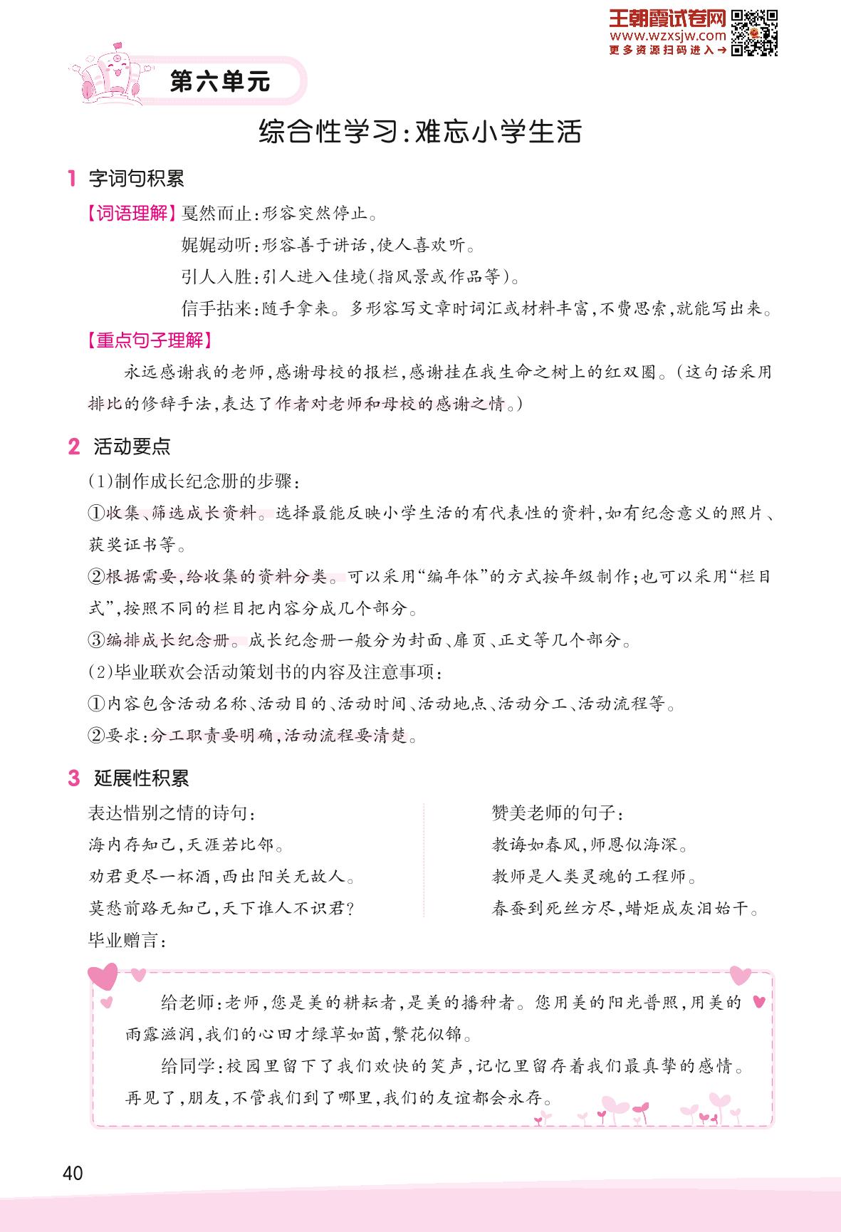 2023下册六年级语文人教版 助学手册 第六单元——综合性学习:难忘小学生活