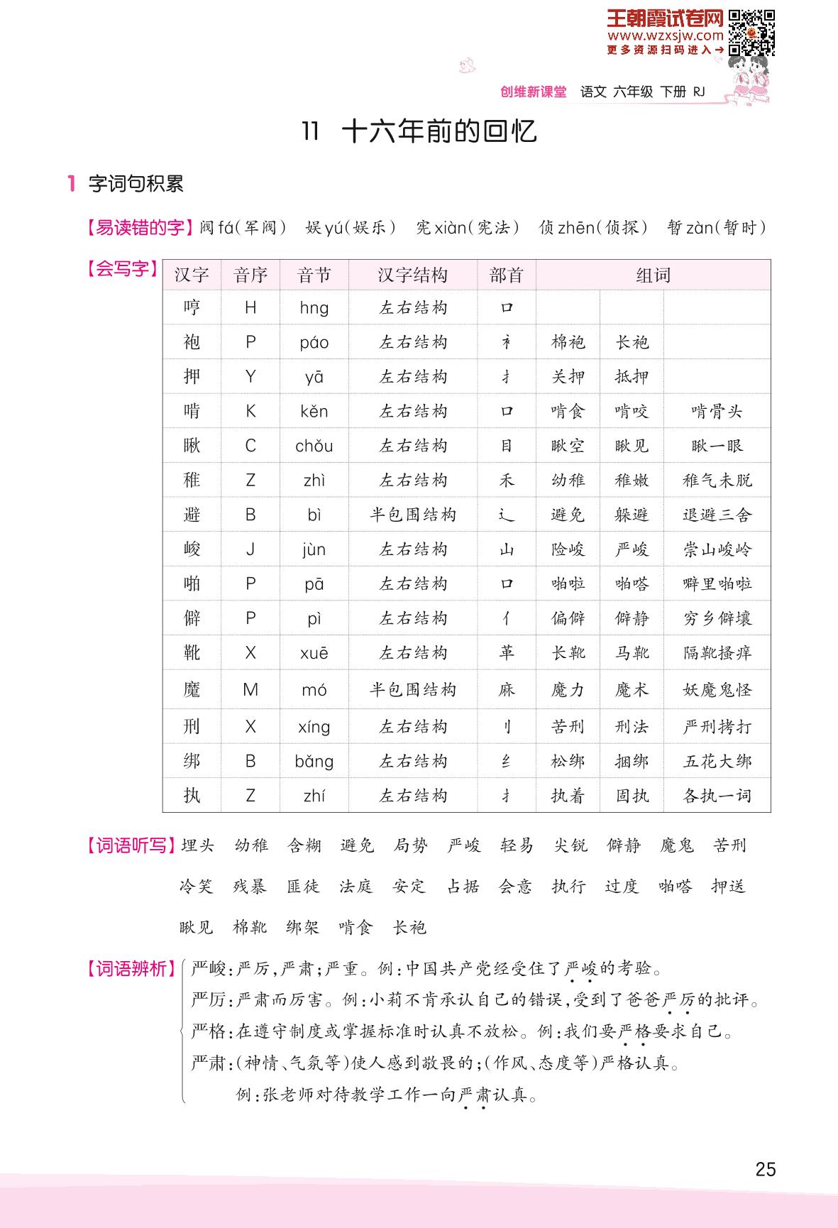 2023下册六年级语文人教版 助学手册 第四单元——11 十六年前的回忆