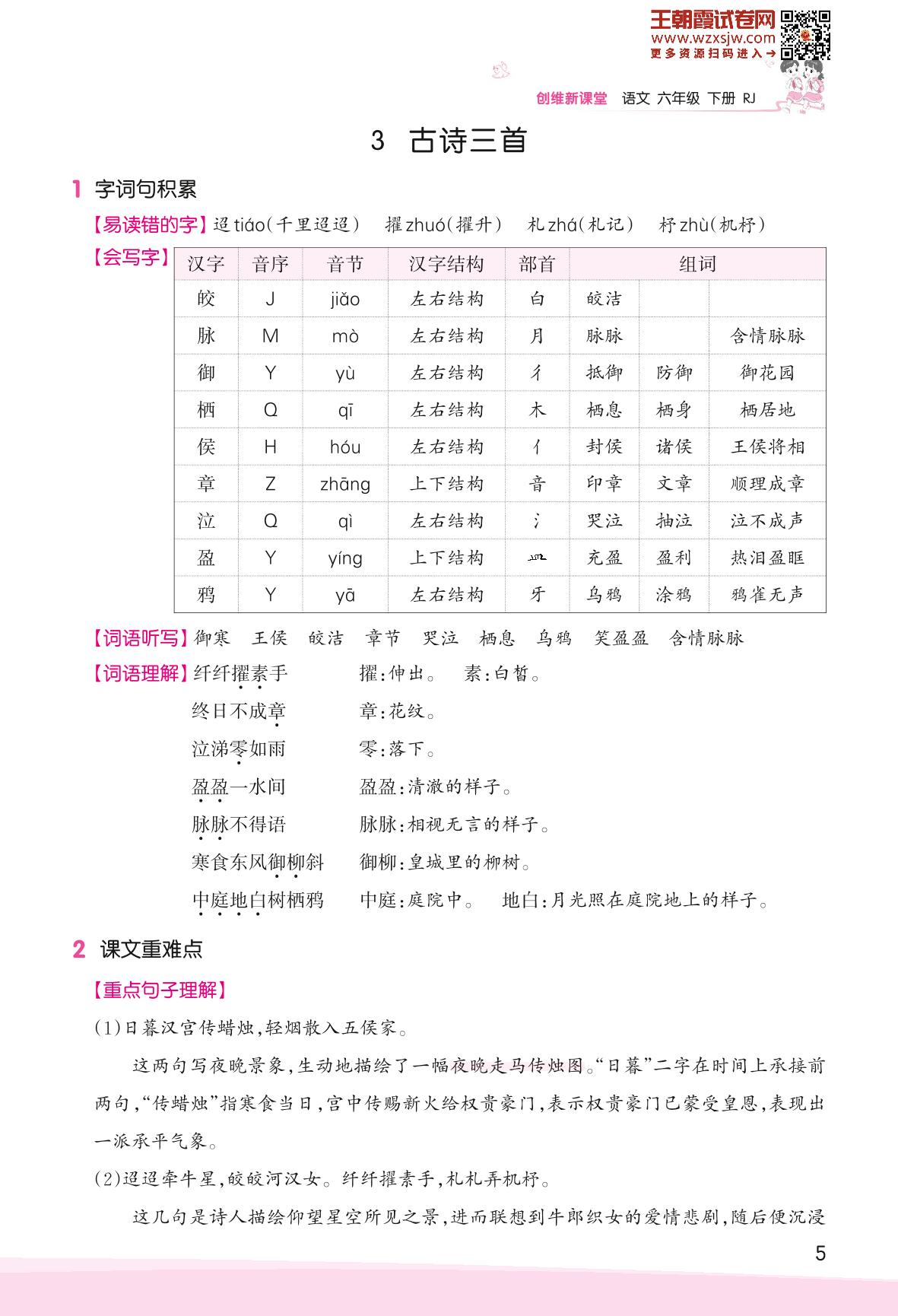 2023下册六年级语文人教版 助学手册 第一单元——3 古诗三首