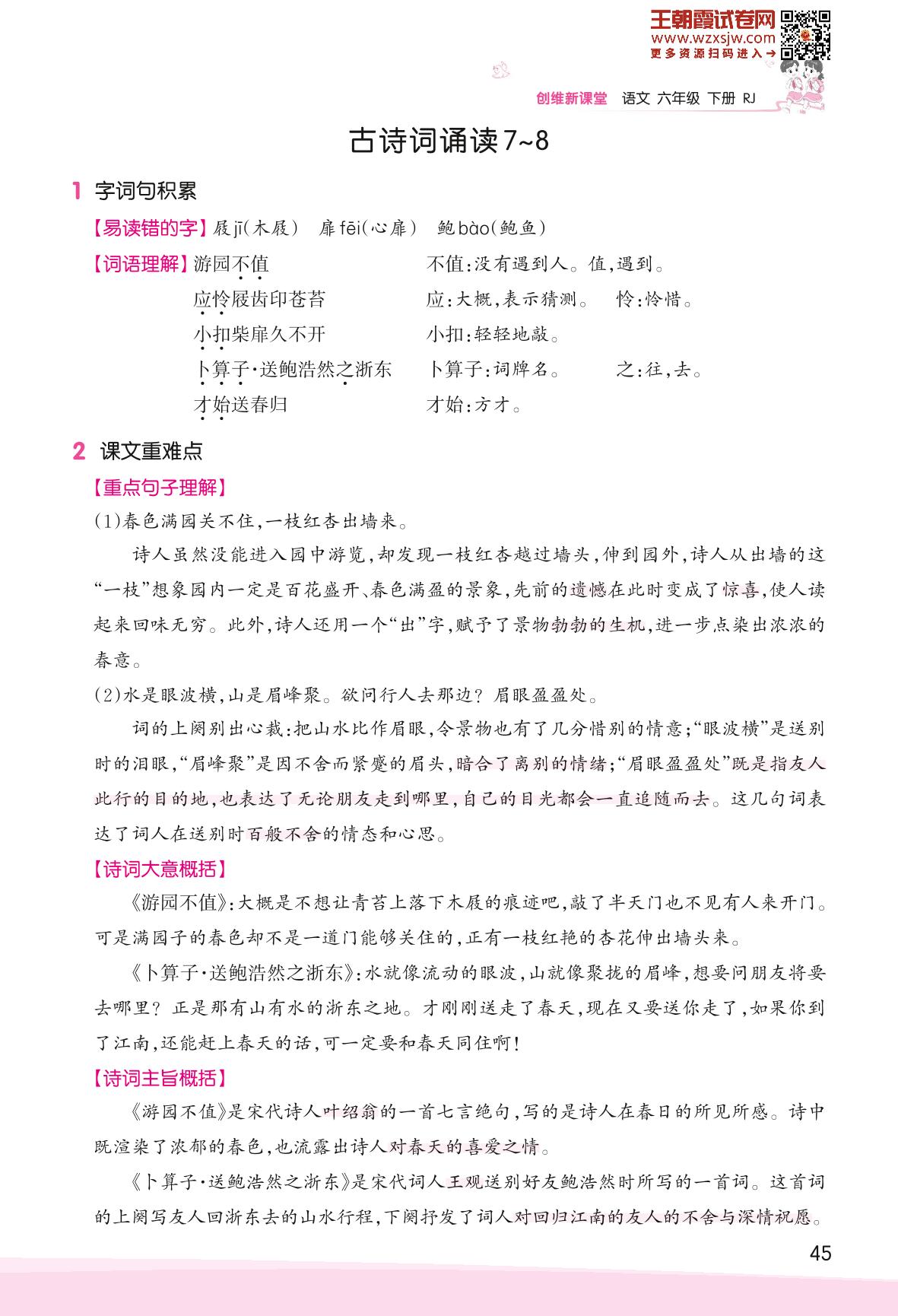 2023下册六年级语文人教版 助学手册 古诗词诵读——古诗词诵读7~8