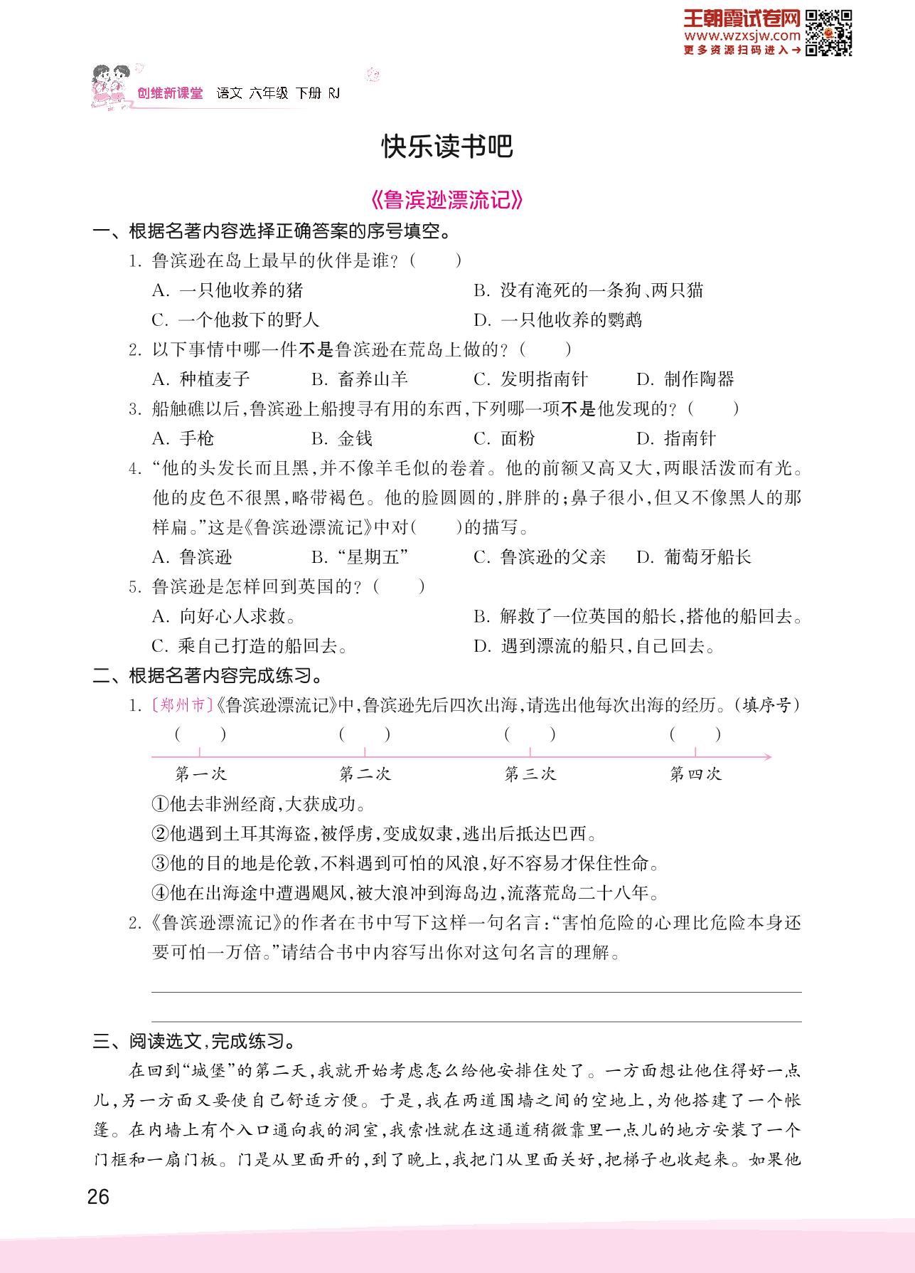 2023下册六年级语文人教版 第二单元 外国文学名著——快乐读书吧