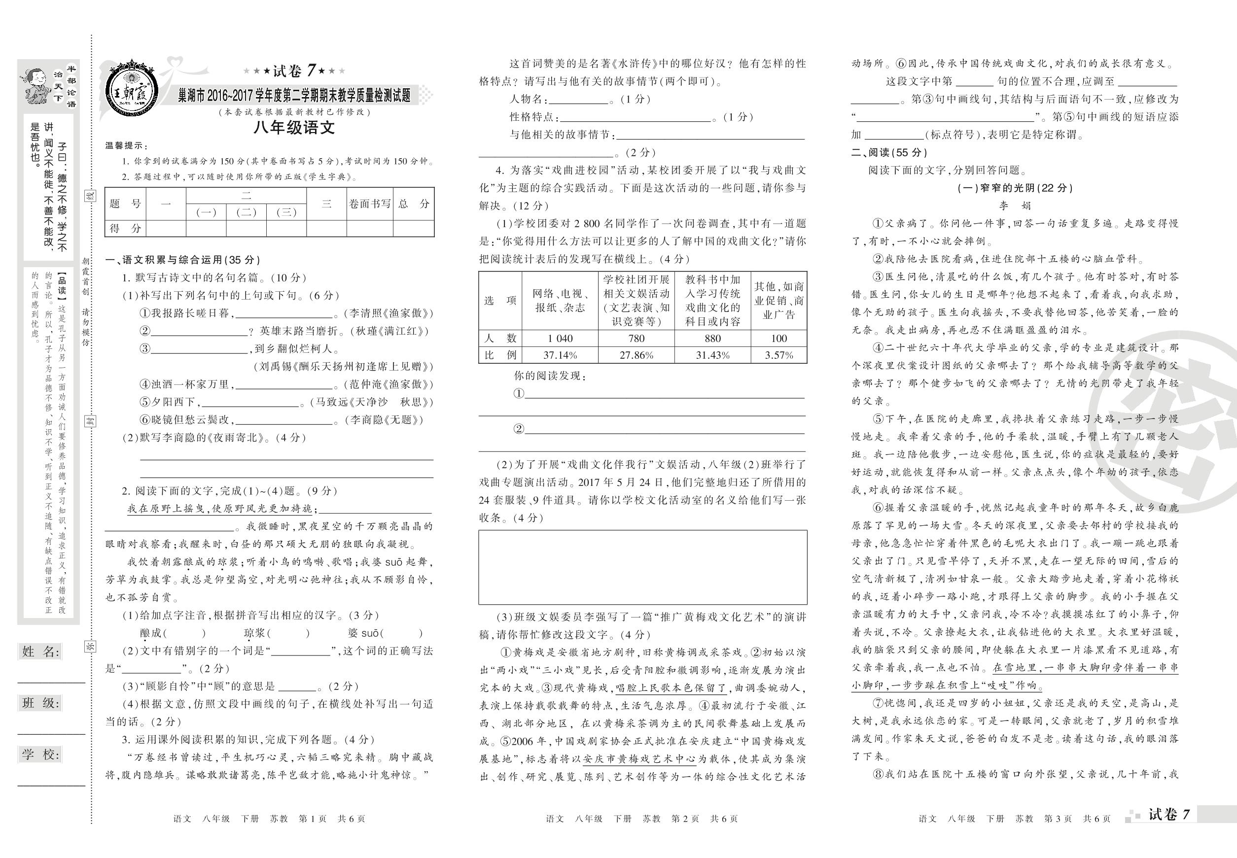 2016-2017学年第二学期巢湖市八年级语文试卷(苏教版)【7】