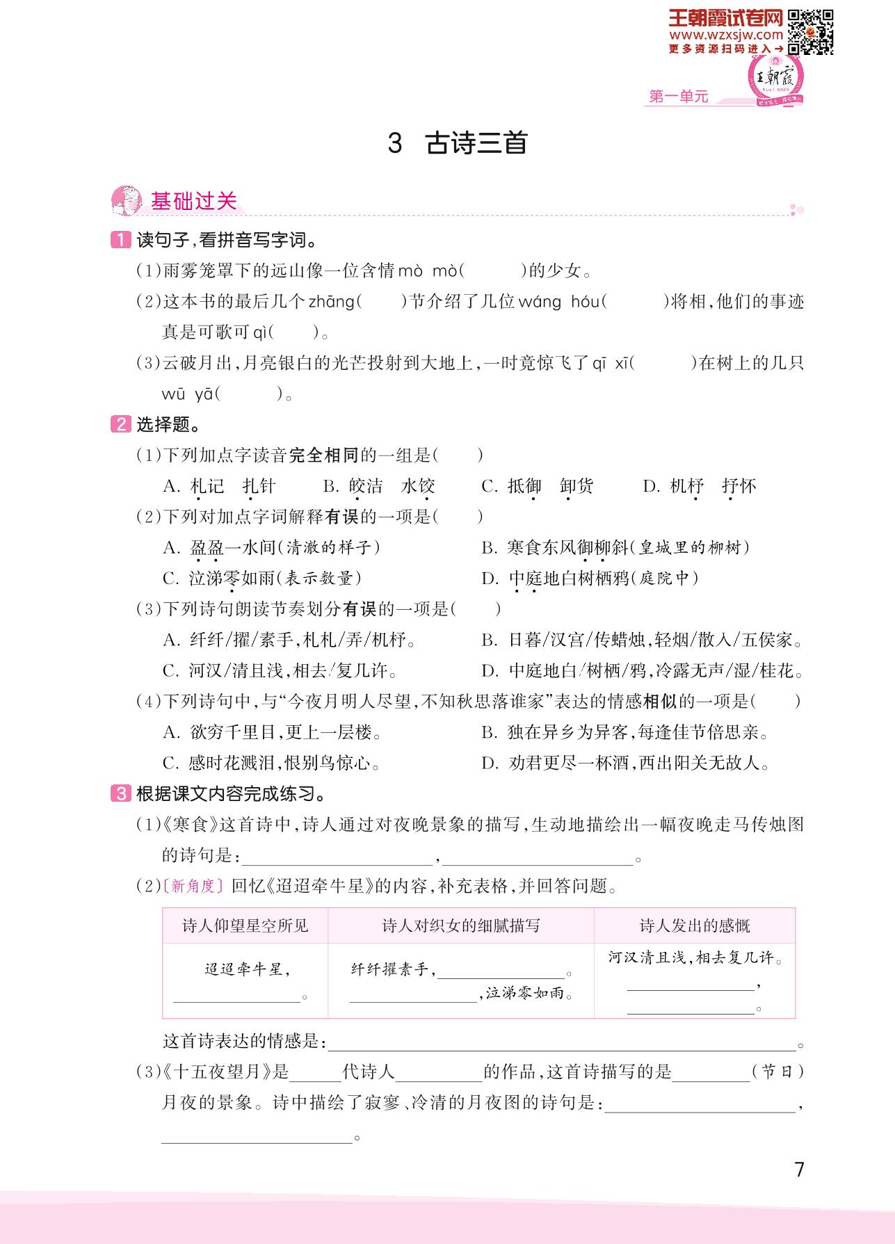 2023下册六年级语文人教版 第一单元 民风民俗——3 古诗三首