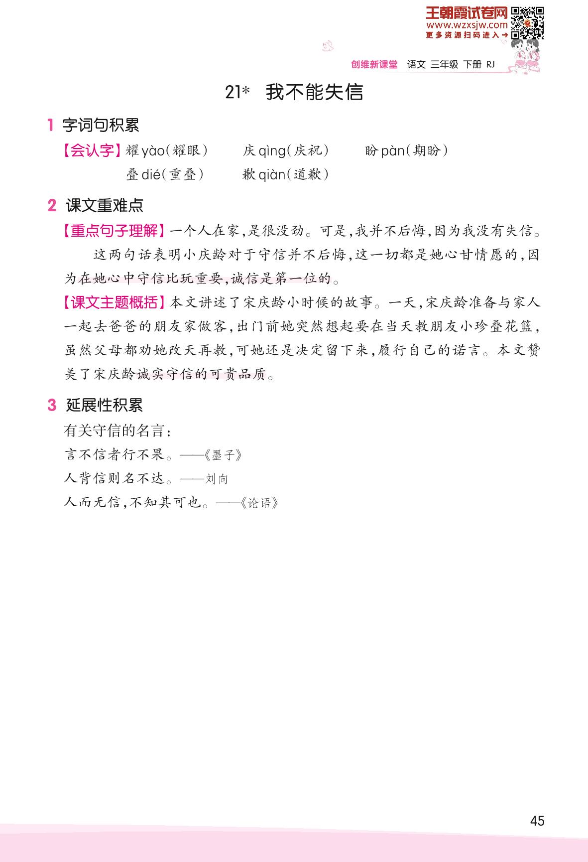 2023下册三年级语文人教版 助学手册 第六单元——21 我不能失信