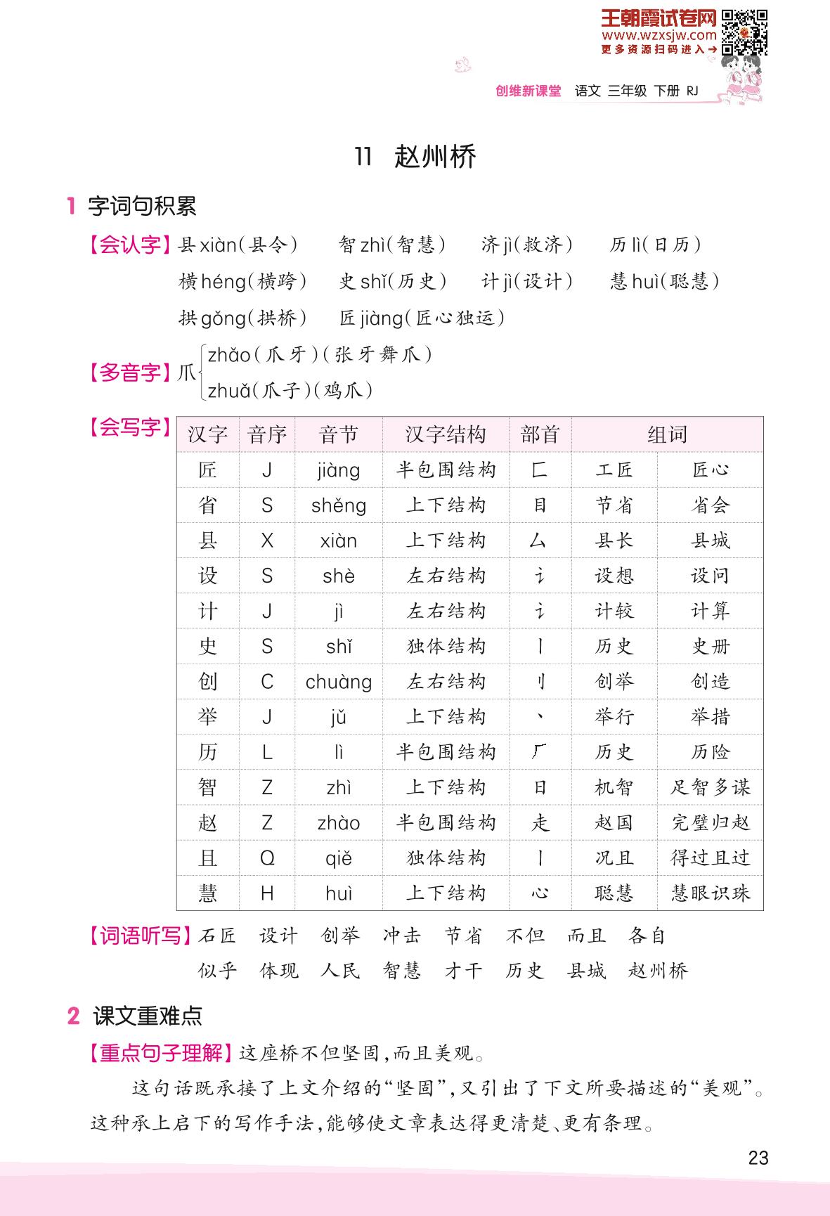 2023下册三年级语文人教版 助学手册 第三单元——11 赵州桥