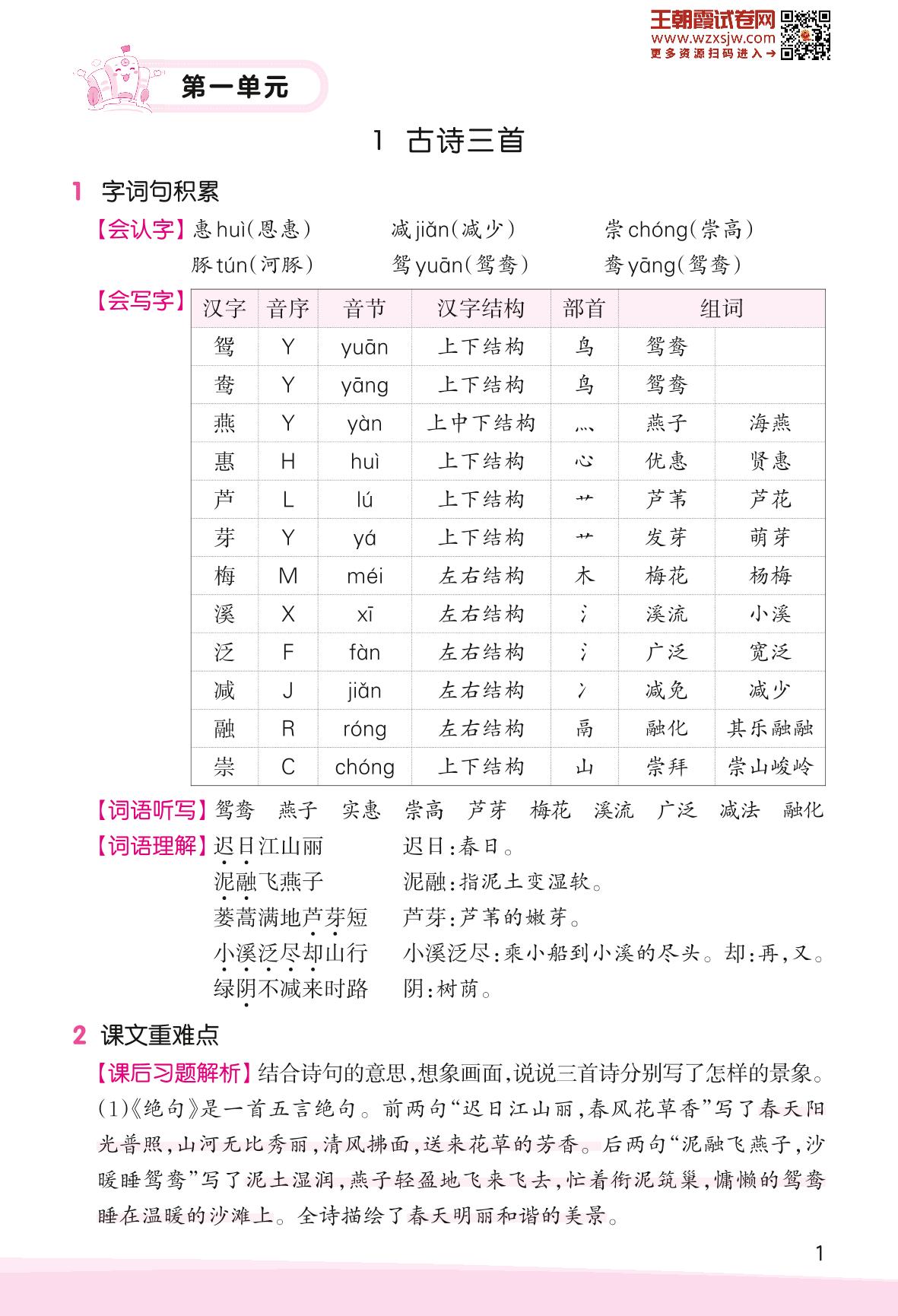 2023下册三年级语文人教版 助学手册 第一单元——1 古诗三首
