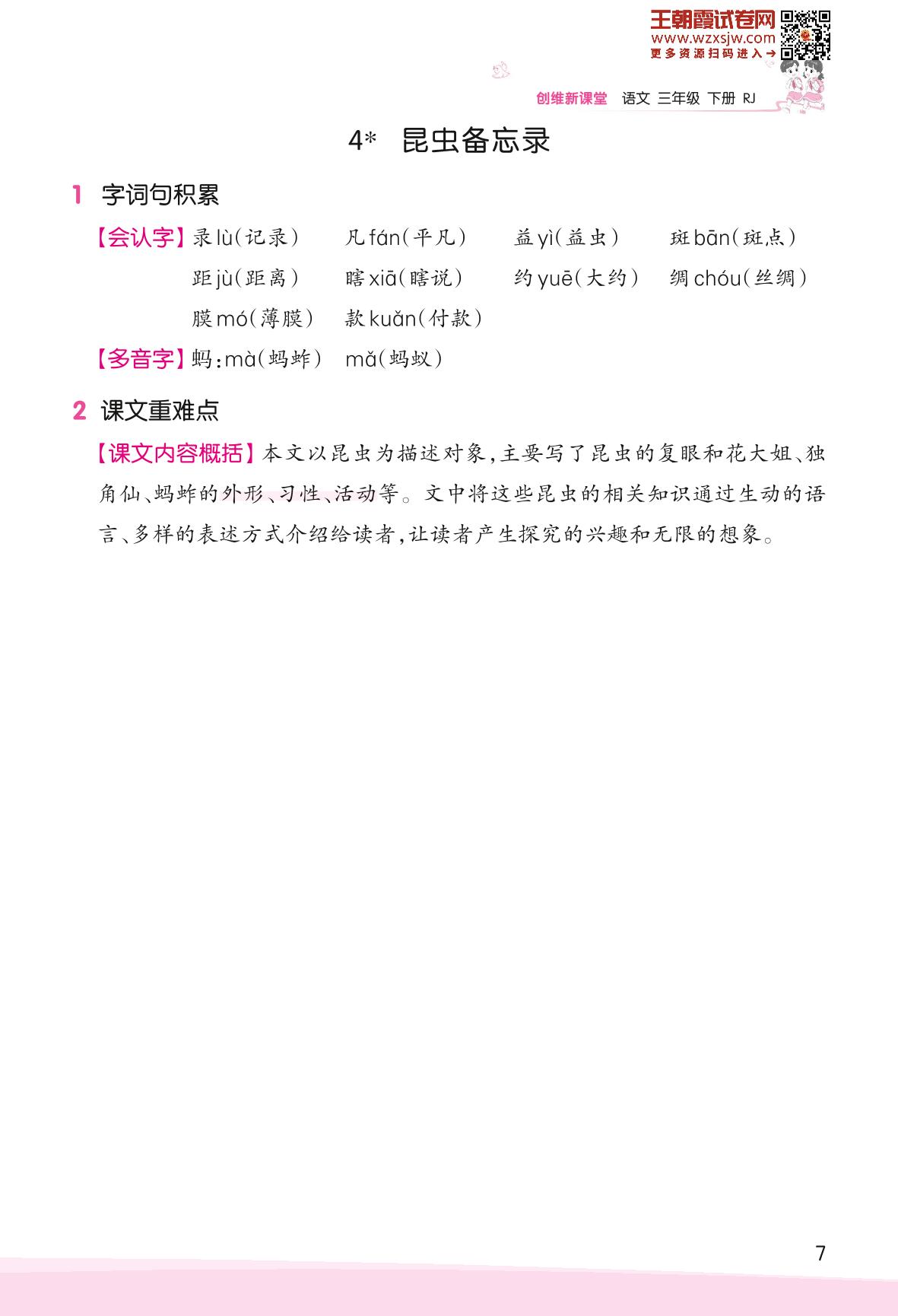 2023下册三年级语文人教版 助学手册 第一单元——4 昆虫备忘录