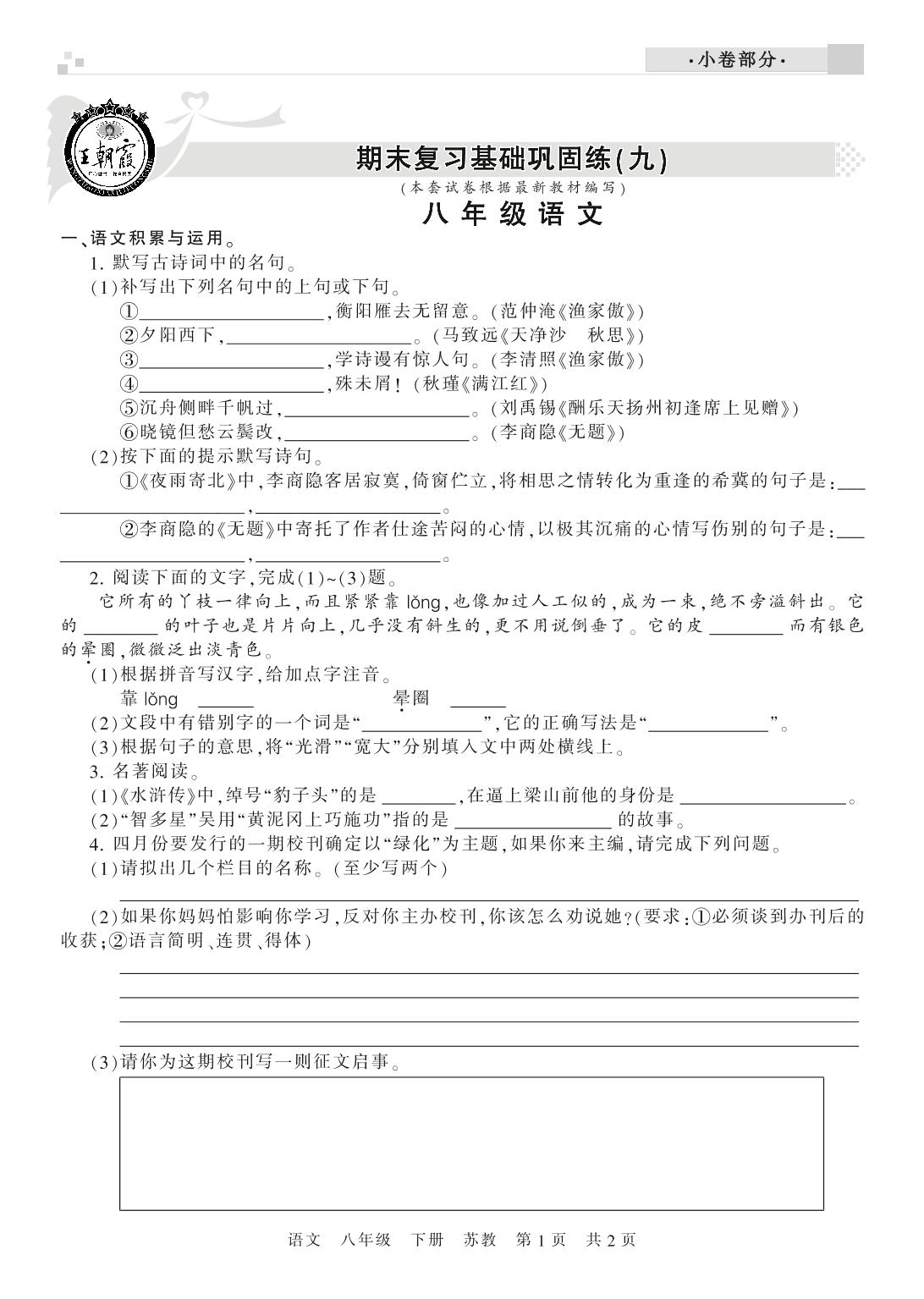 王朝霞期末小卷期末复习基础巩固练(九)八年级下册语文(苏教版)【0】