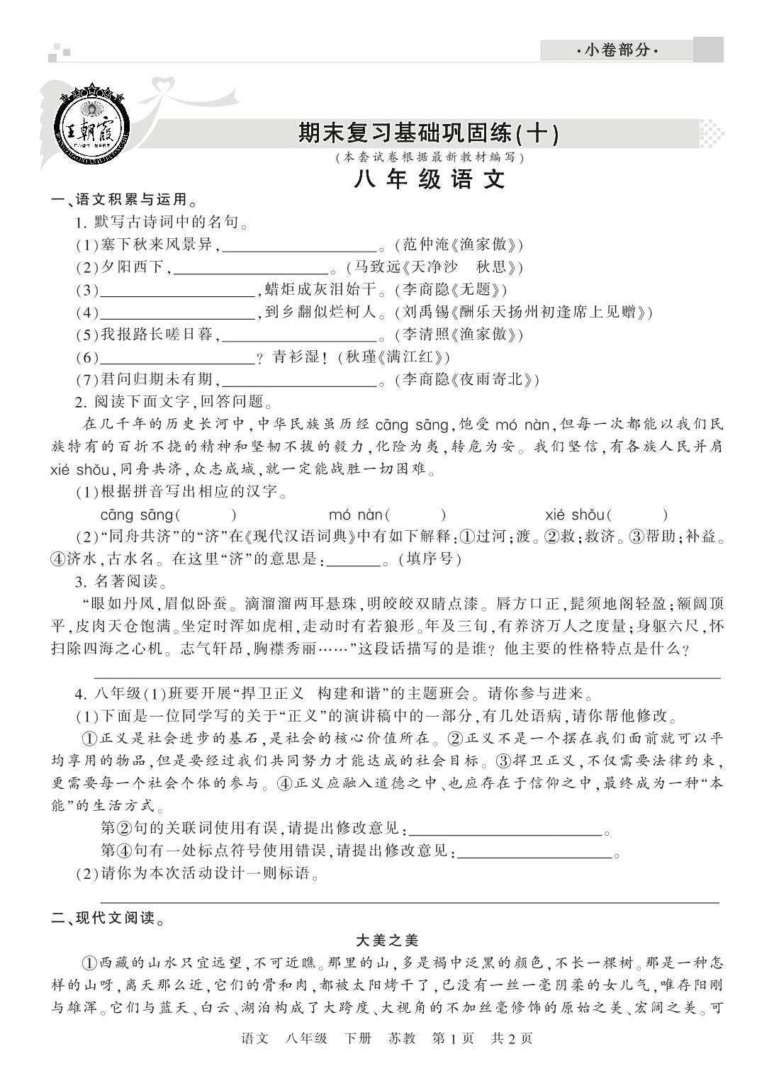王朝霞期末小卷期末复习基础巩固练(十)八年级下册语文(苏教版)【0】