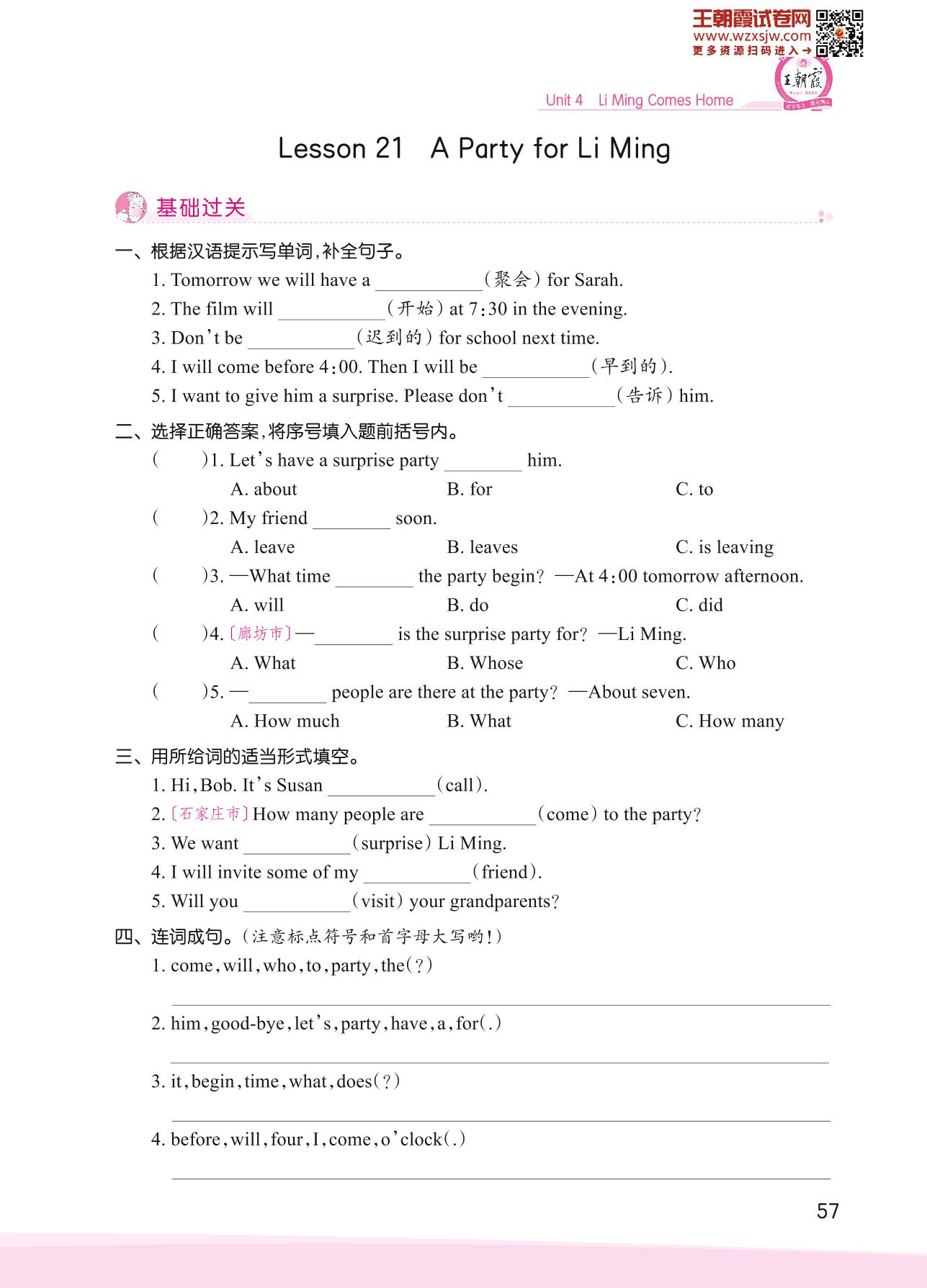 2023下册六年级英语冀教版 Unit 4—Lesson 21 A Party for Li Ming