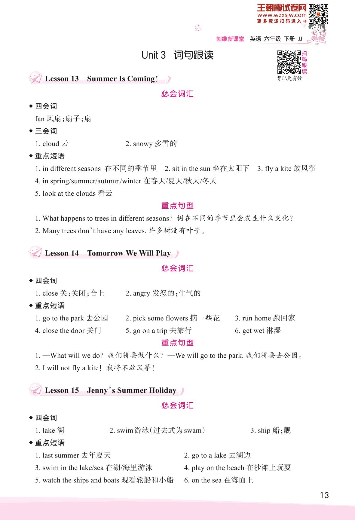 2023下册六年级英语冀教版 Unit 3 What Will You Do This Summer ?—词句跟读