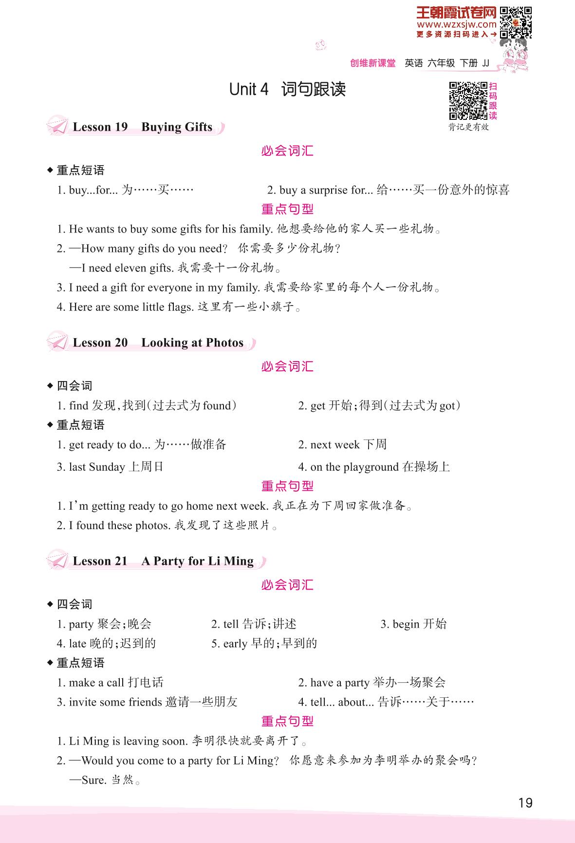 2023下册六年级英语冀教版 Unit 4 Li Ming Comes Home—词句跟读
