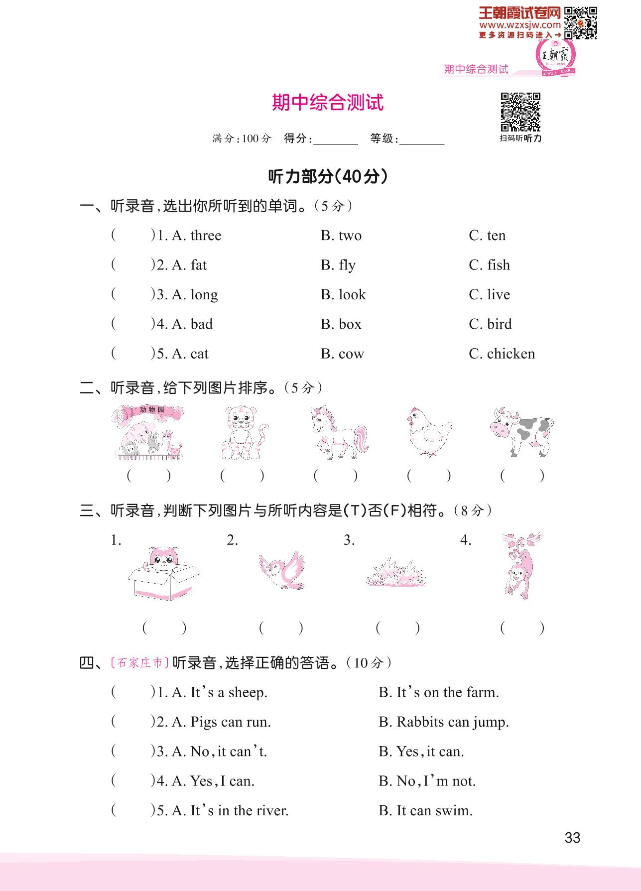 三年级英语冀教版下册期中卷
