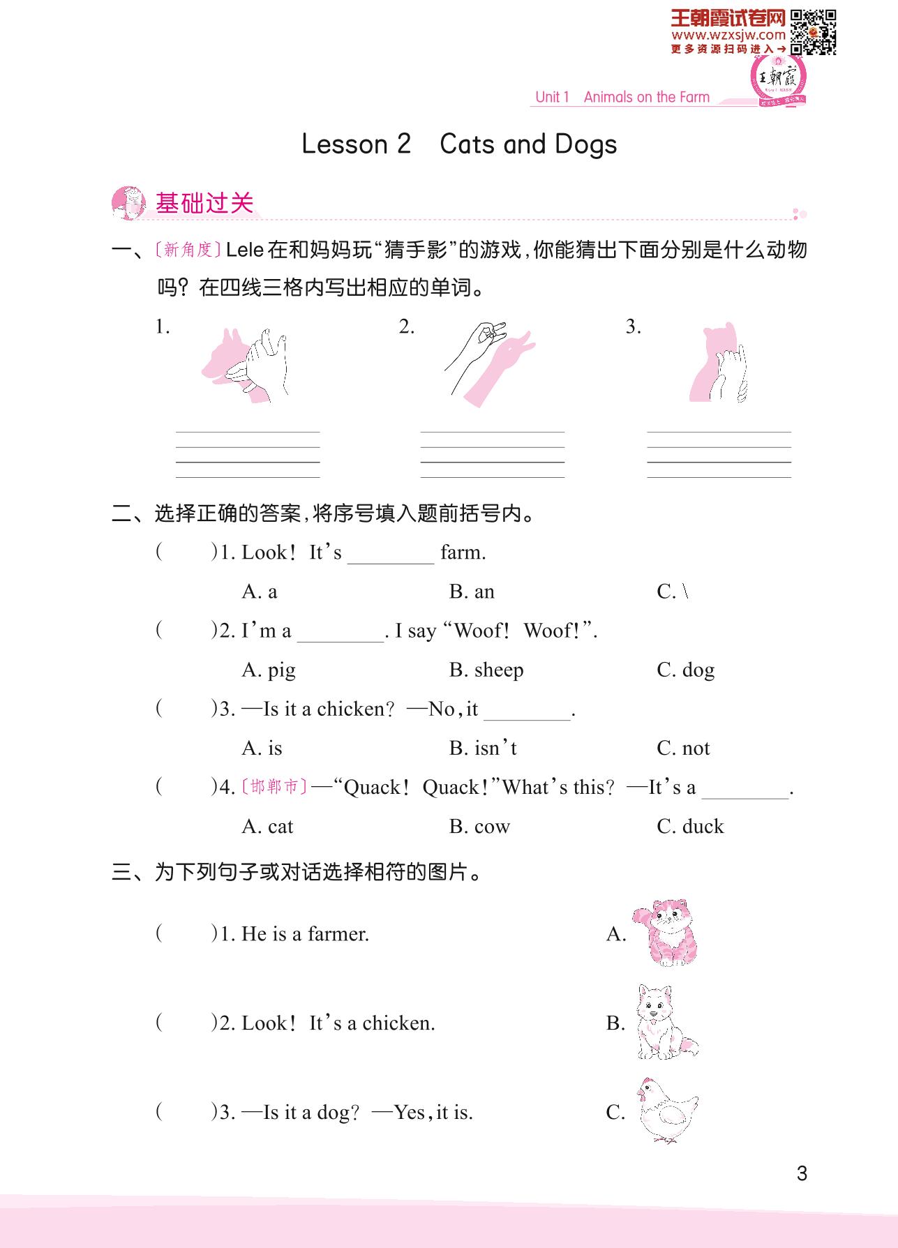 2023下册三年级英语冀教版 Unit 1—Lesson 2 Cats and Dogs