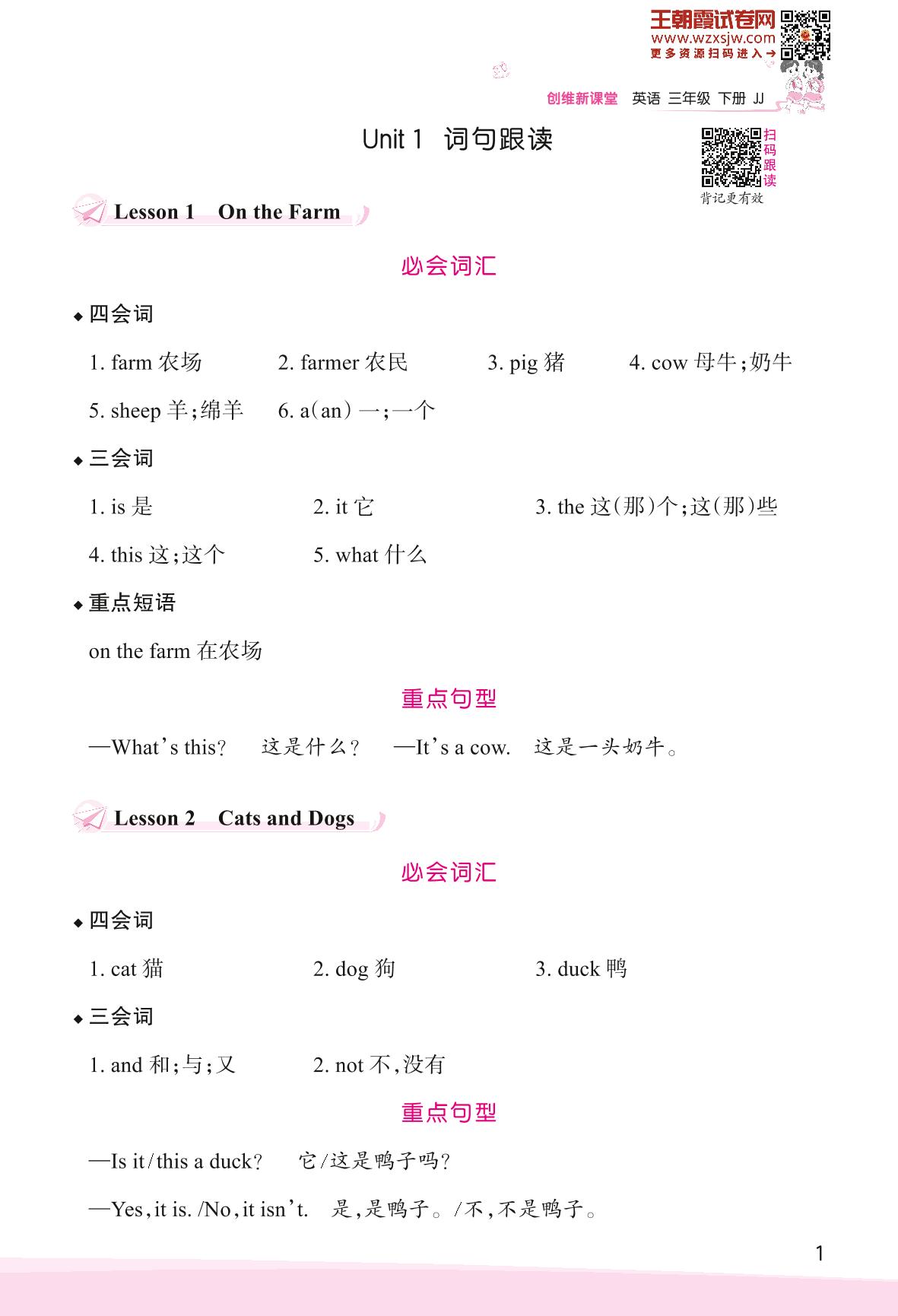 2023下册三年级英语冀教版 Unit 1 Animals on the Farm —词句跟读