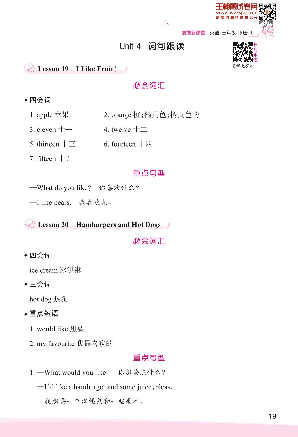 2023下册三年级英语冀教版 Unit 4 Food and Restaurants—词句跟读