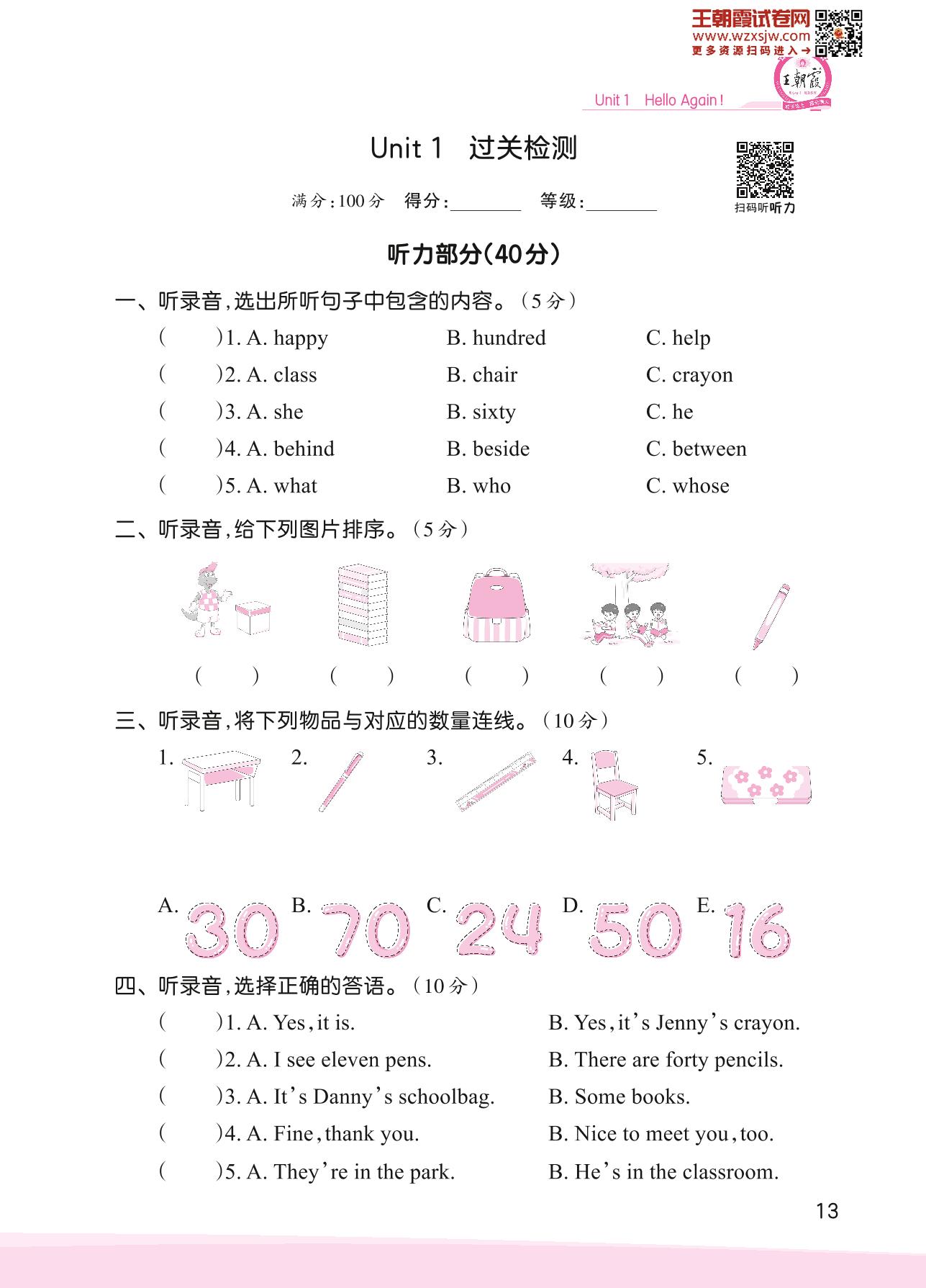 2023下册四年级英语冀教版 Unit 1 过关检测