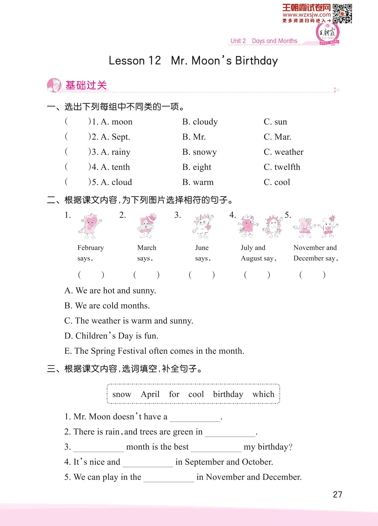 2023下册四年级英语冀教版 Unit 2—Lesson 12 Mr. Moon’s Birthday