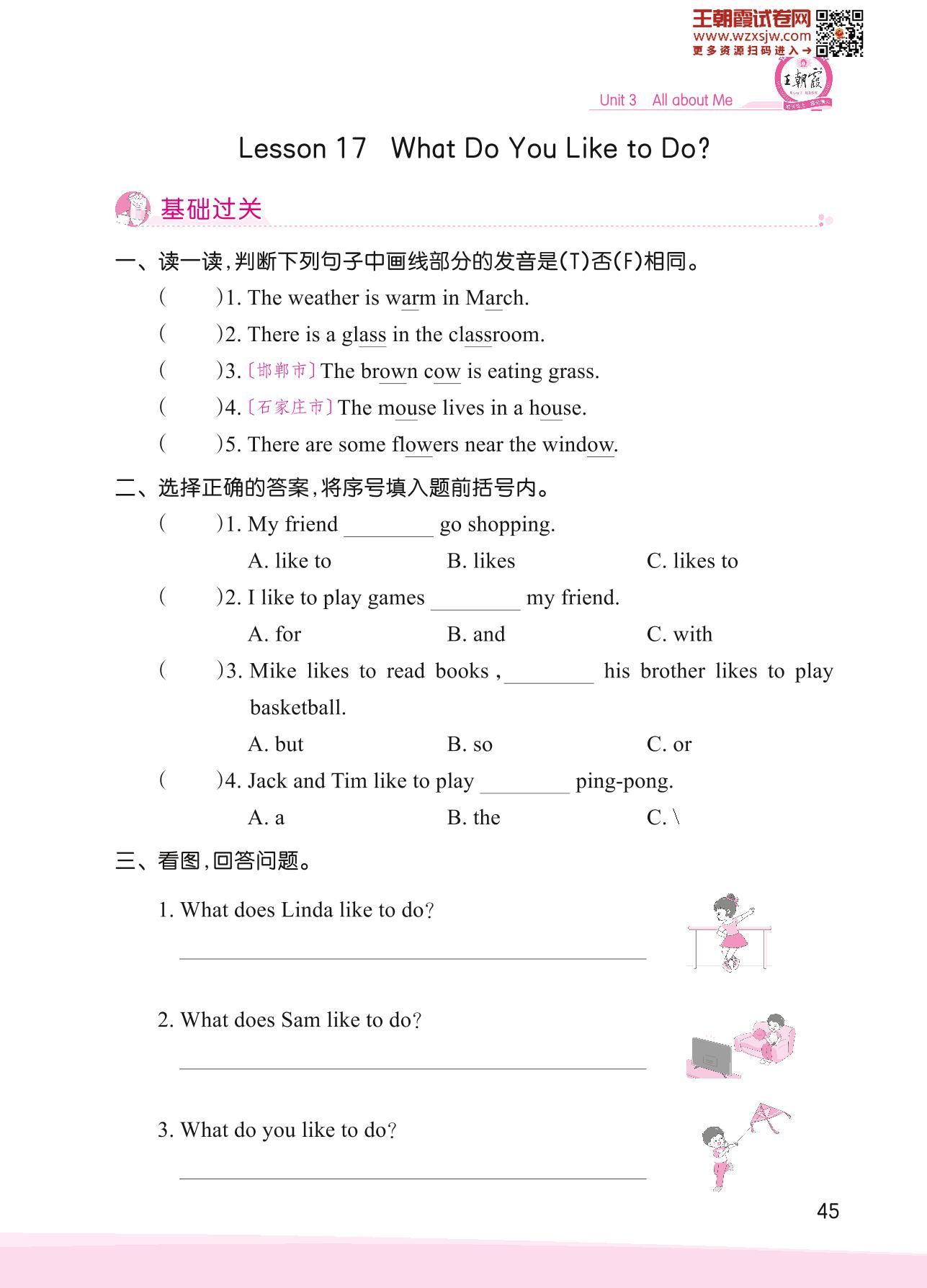 2023下册四年级英语冀教版 Unit 3—Lesson 17 What Do You Like to Do?