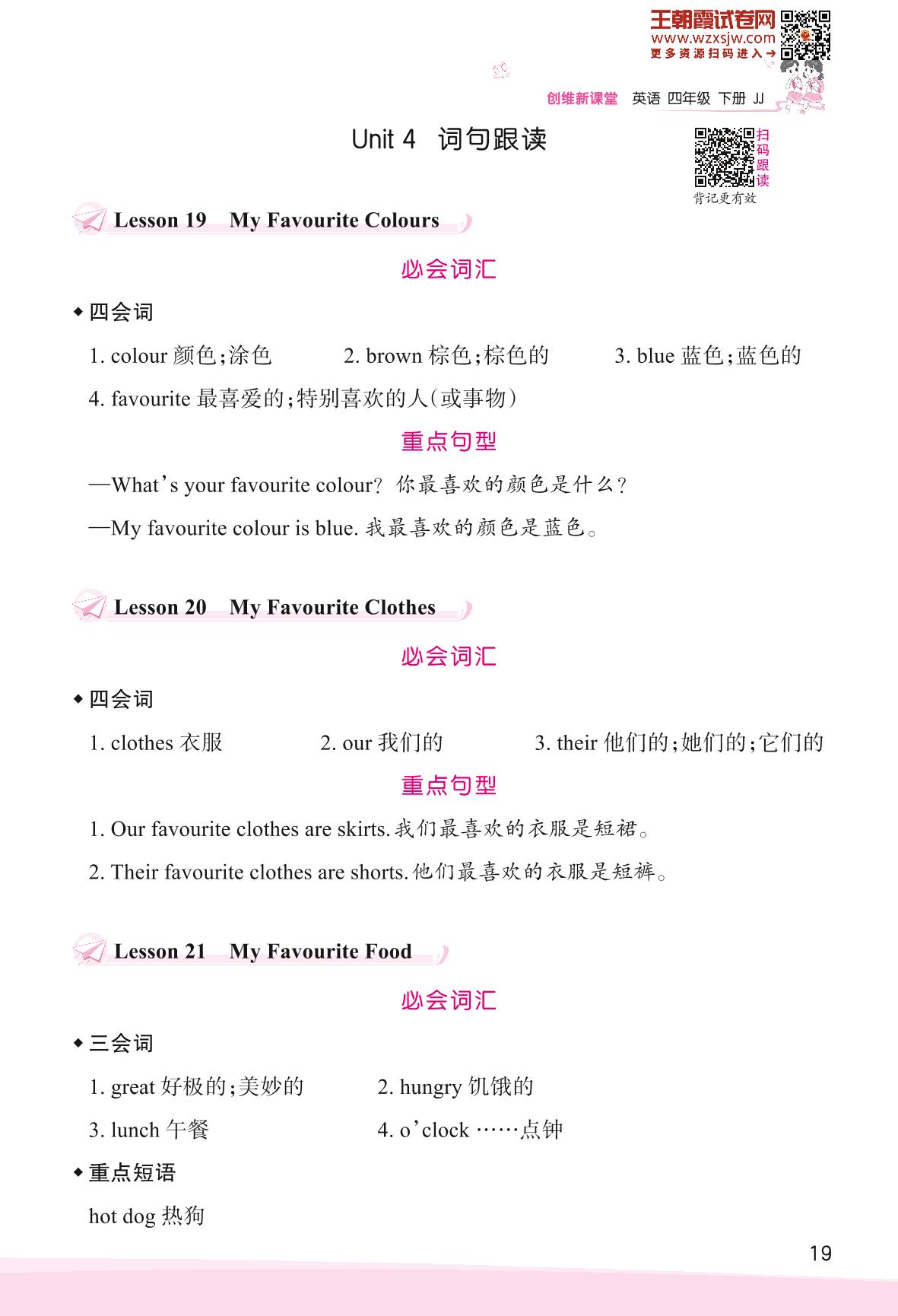 2023下册四年级英语冀教版 Unit 4 My Favourites—词句跟读
