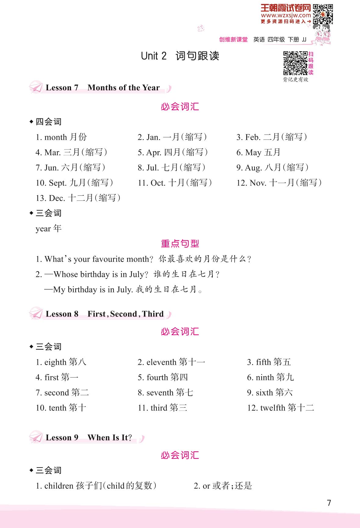 2023下册四年级英语冀教版 Unit 2 Days and Months—词句跟读