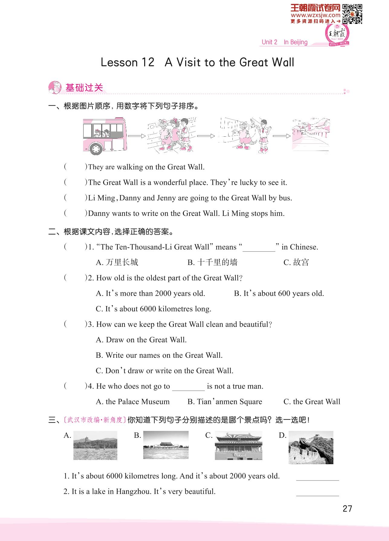 2023下册五年级英语冀教版 Unit 2—Lesson 12 A Visit to the Great Wall