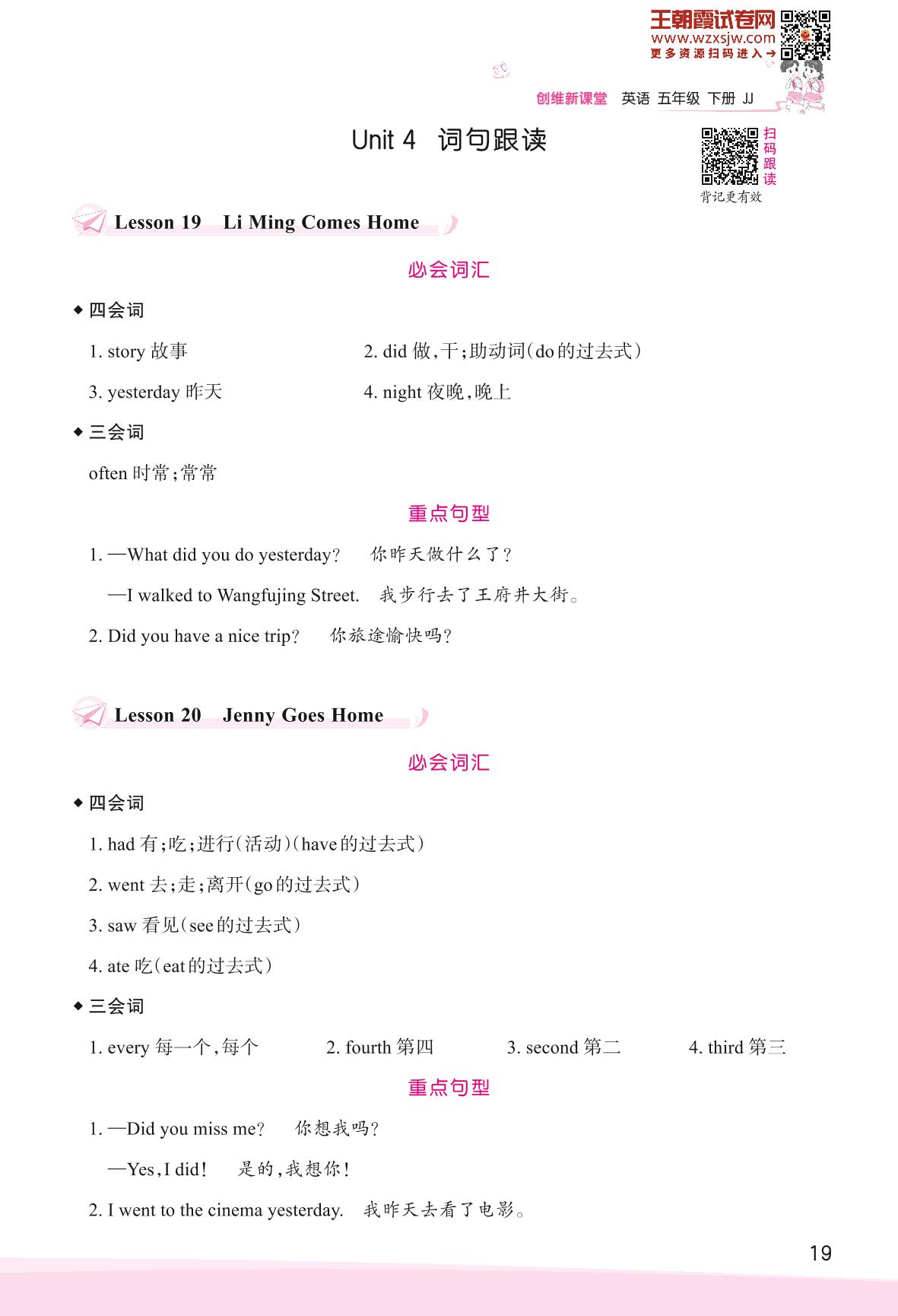 2023下册五年级英语冀教版 Unit 4 Did You Have a Nice Trip?—词句跟读