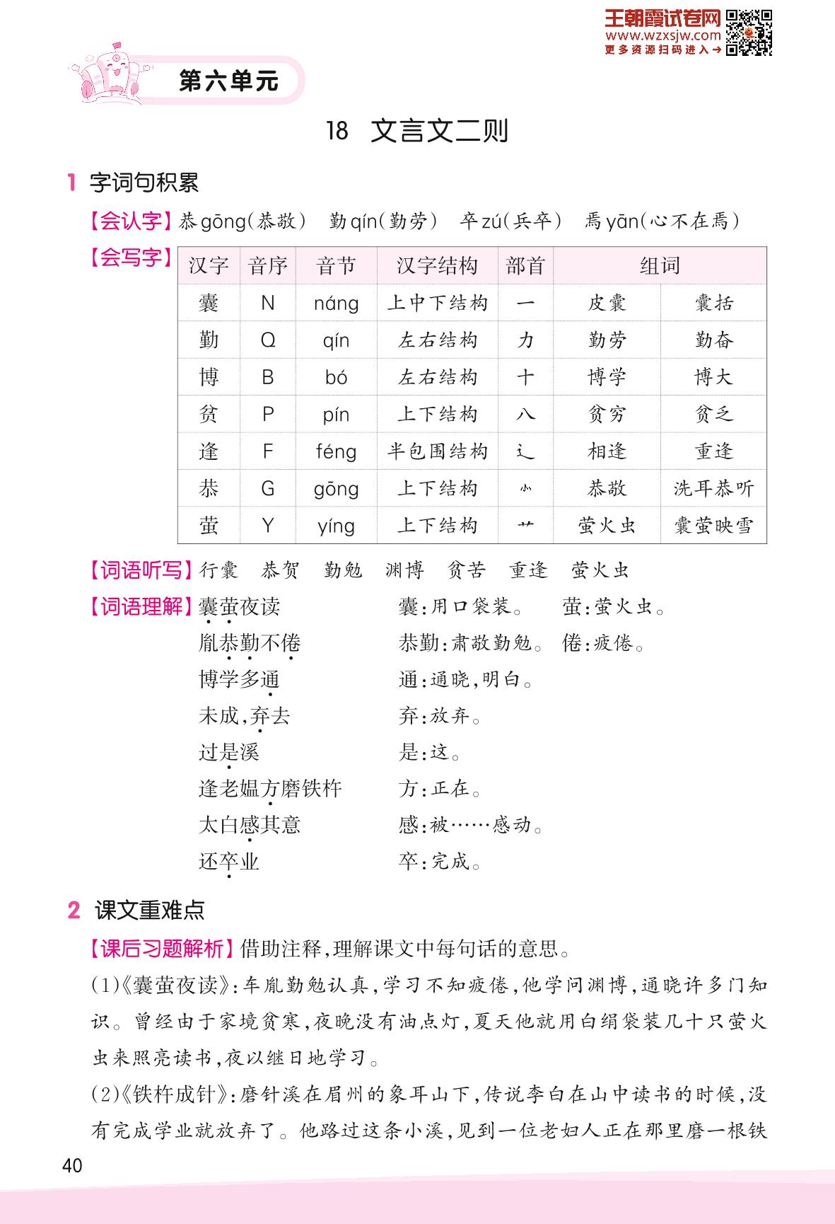 2023下册四年级语文人教版 助学手册 第六单元——18 文言文二则