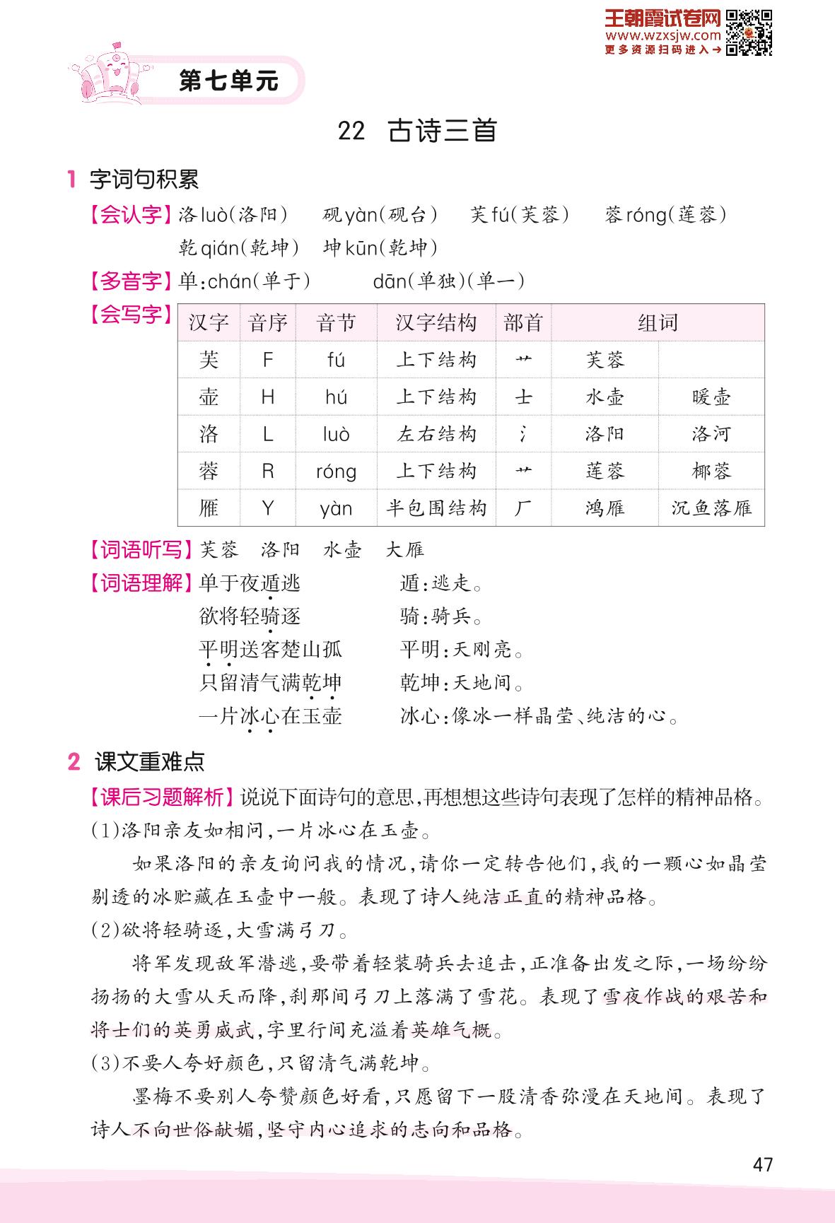 2023下册四年级语文人教版 助学手册 第七单元——22 古诗三首