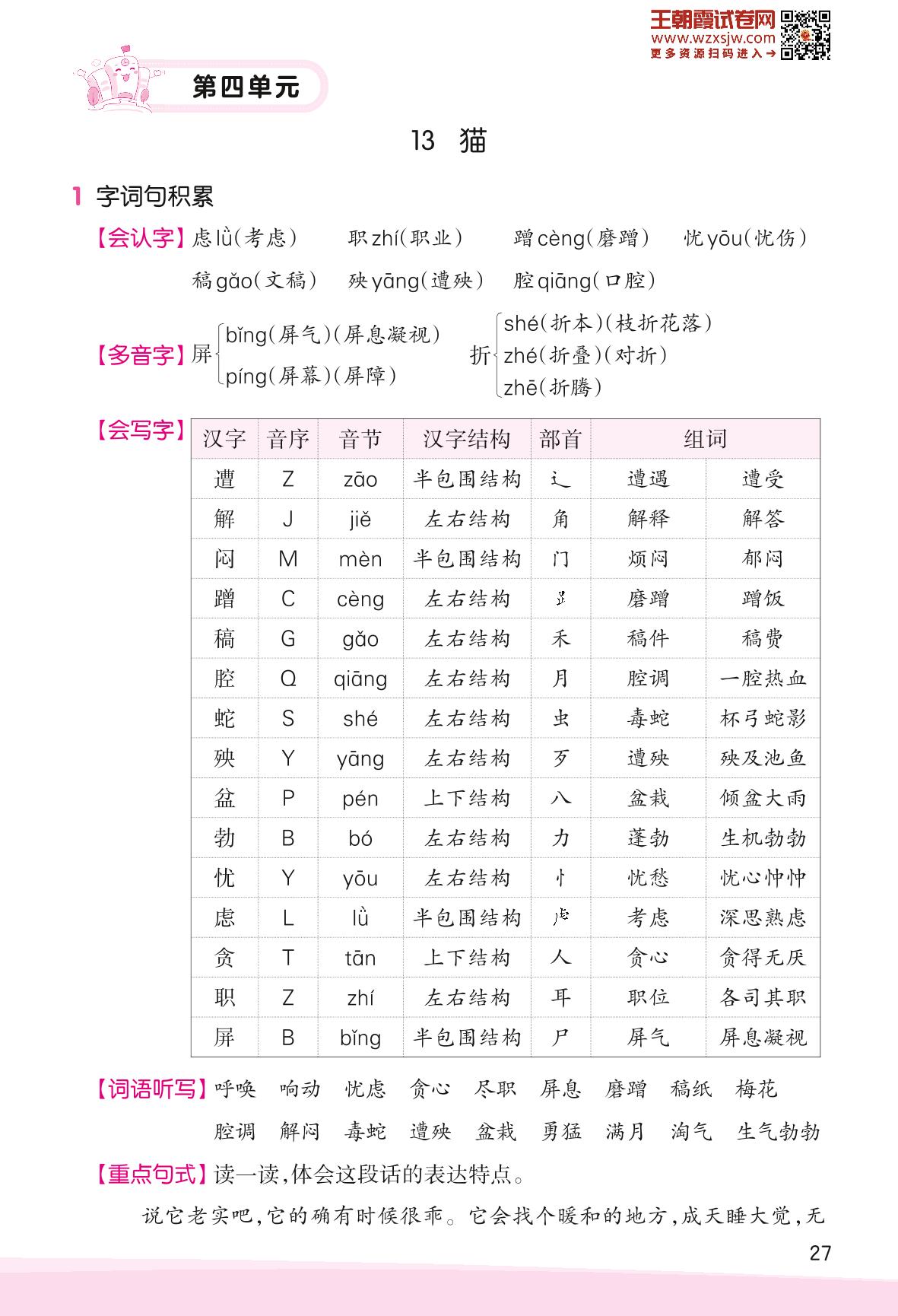 2023下册四年级语文人教版 助学手册 第四单元——13 猫