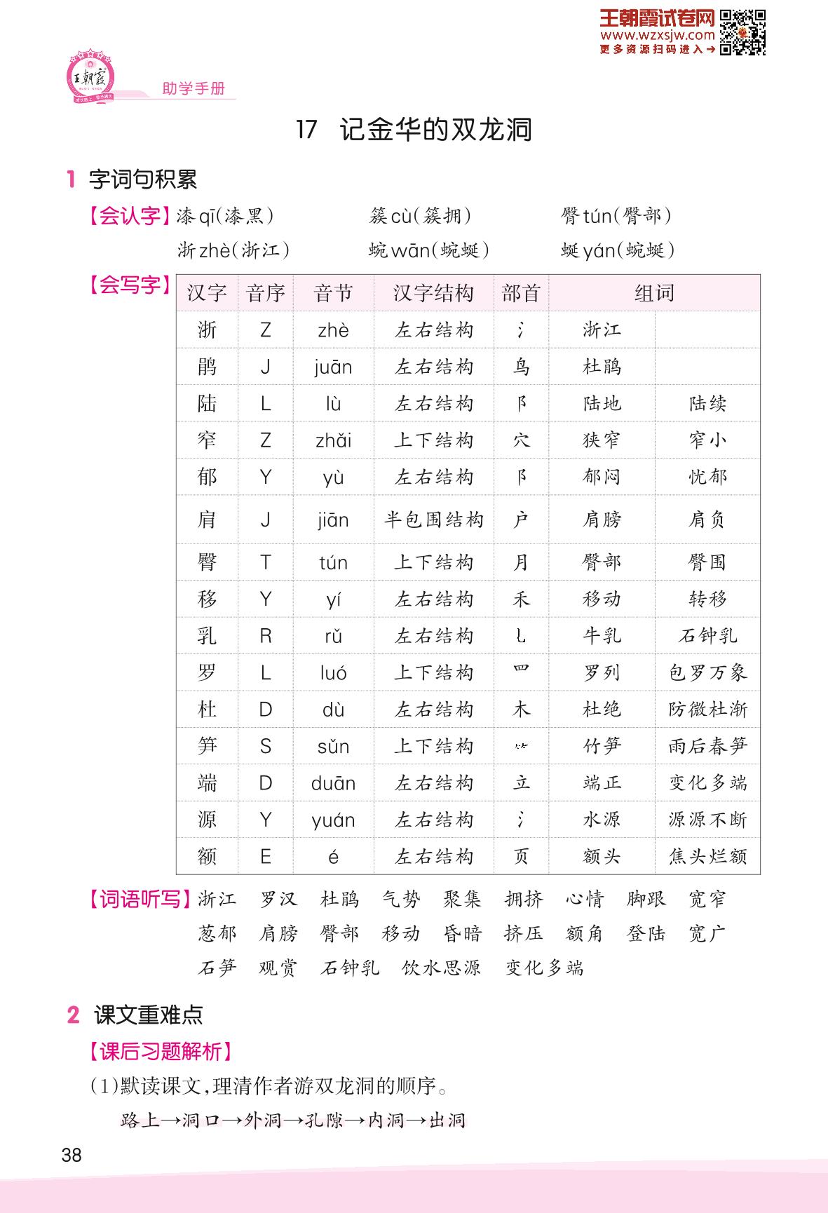 2023下册四年级语文人教版 助学手册 第五单元——17 记金华的双龙洞
