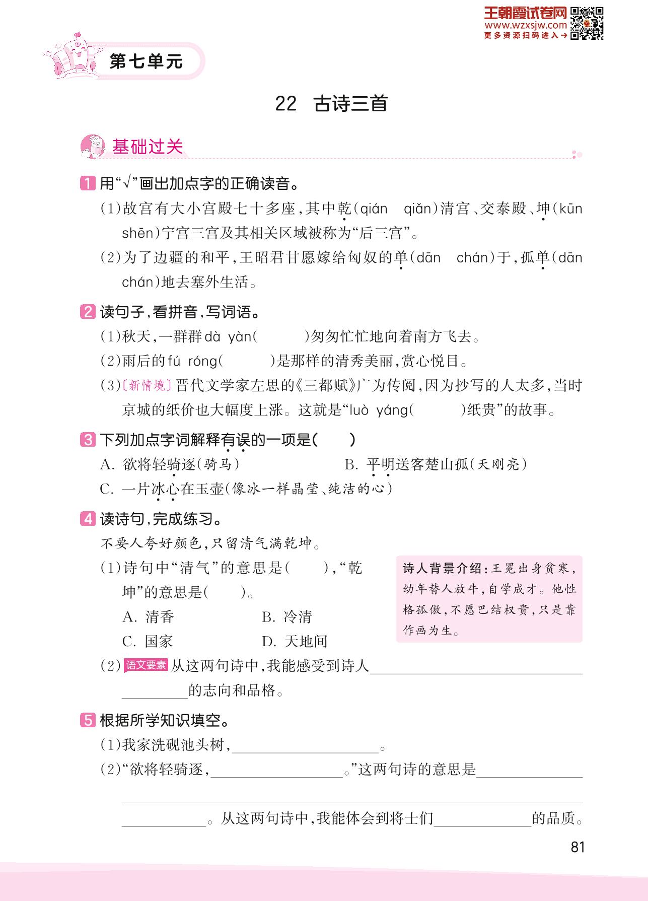 2023下册四年级语文人教版 第七单元 人物品质——22 古诗三首