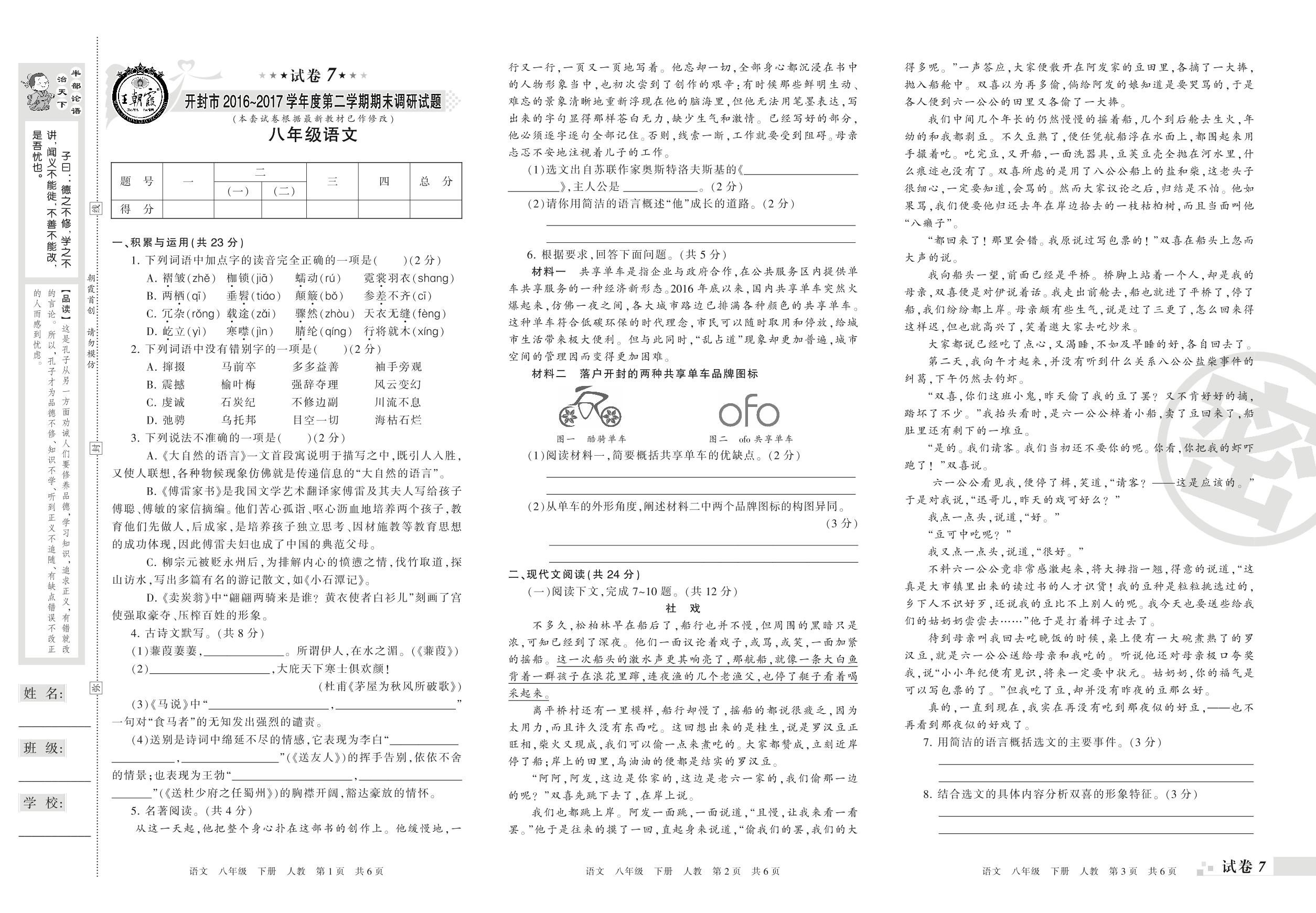 2016-2017学年第二学期开封市八年级语文试卷(人教版)【7】
