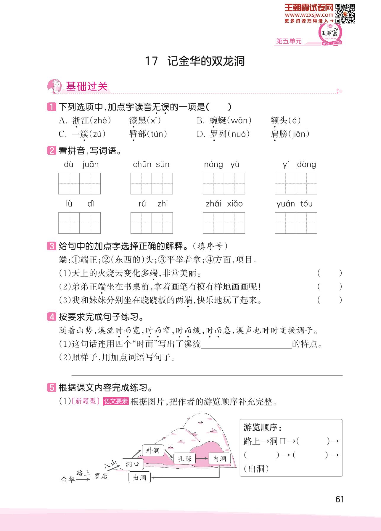2023下册四年级语文人教版 第五单元 按一定顺序写景物——17 记金华的双龙洞
