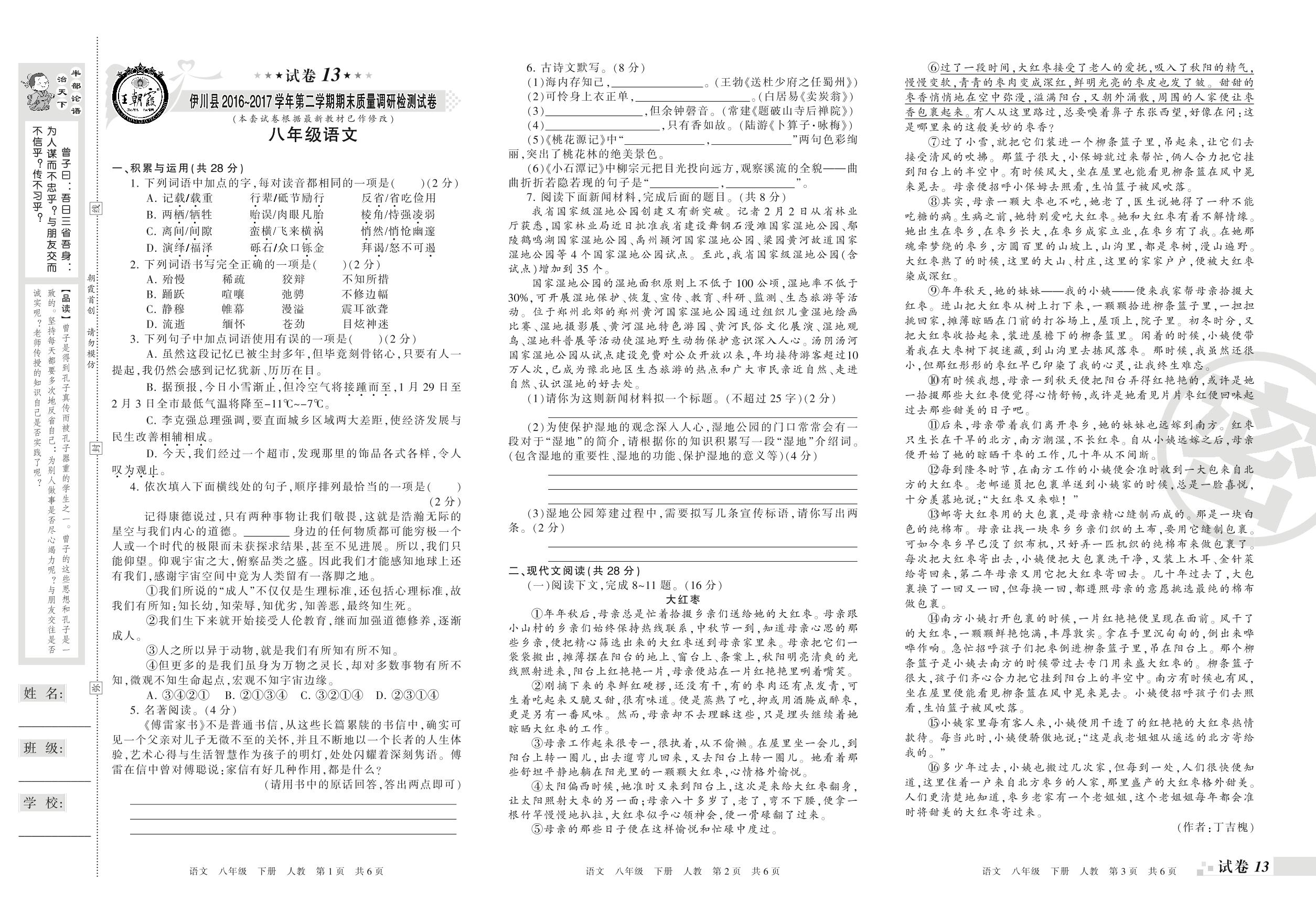 2016-2017学年第二学期洛阳市伊川县八年级语文试卷(人教版)【13】
