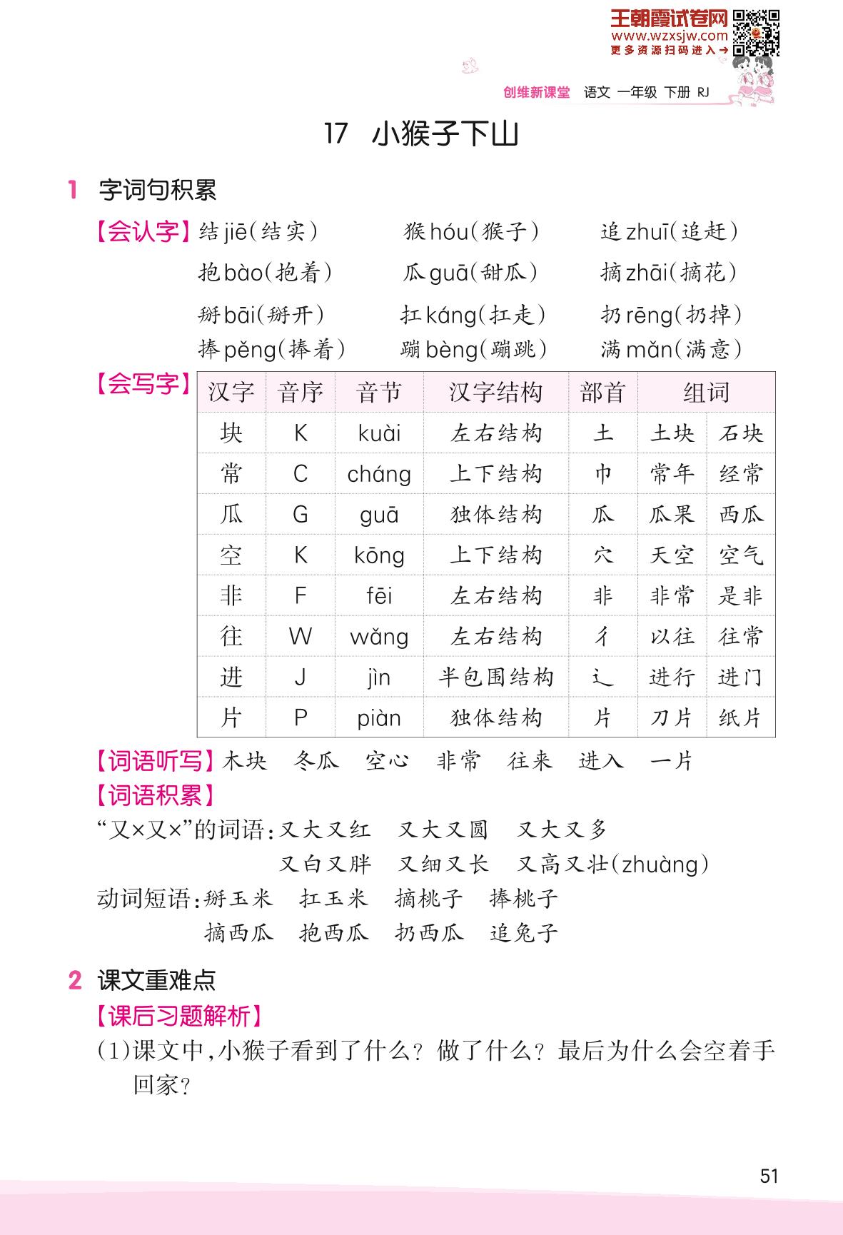 2023下册一年级语文人教版 助学手册 第七单元——17 小猴子下山