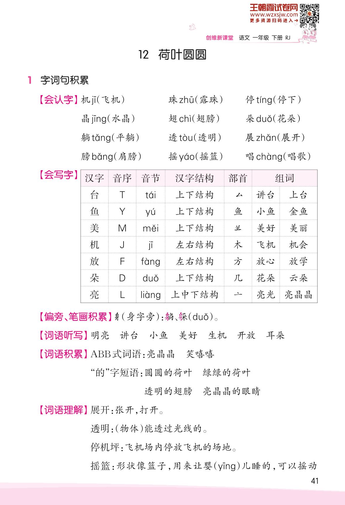 2023下册一年级语文人教版 助学手册 第六单元——12 荷叶圆圆