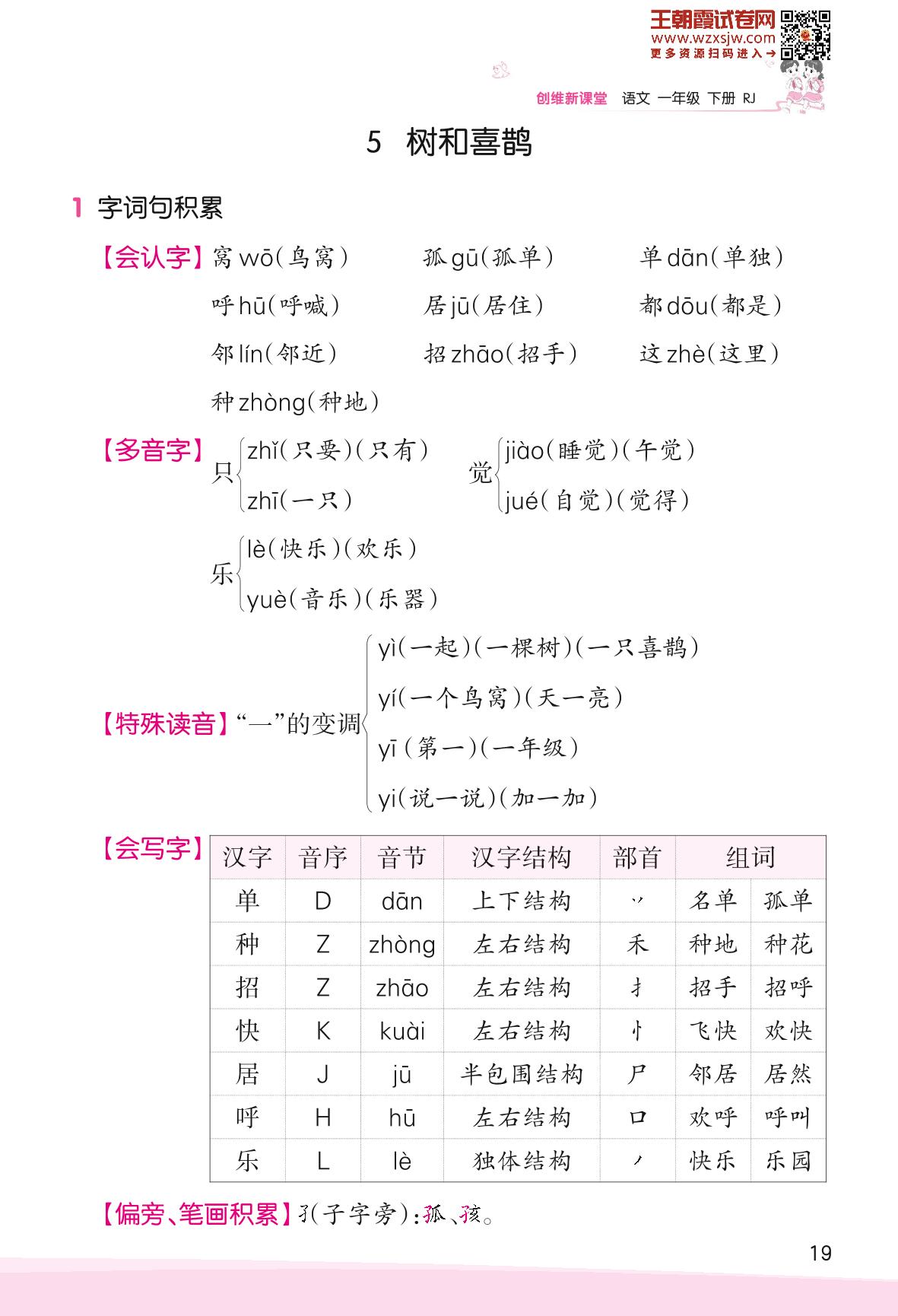 2023下册一年级语文人教版 助学手册 第三单元——5 树和喜鹊